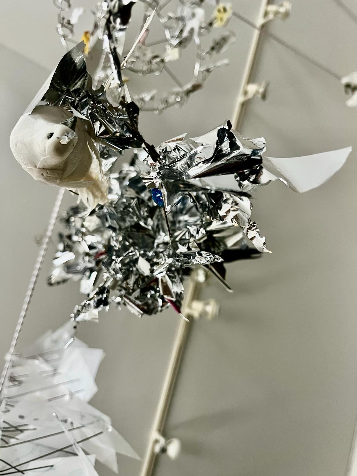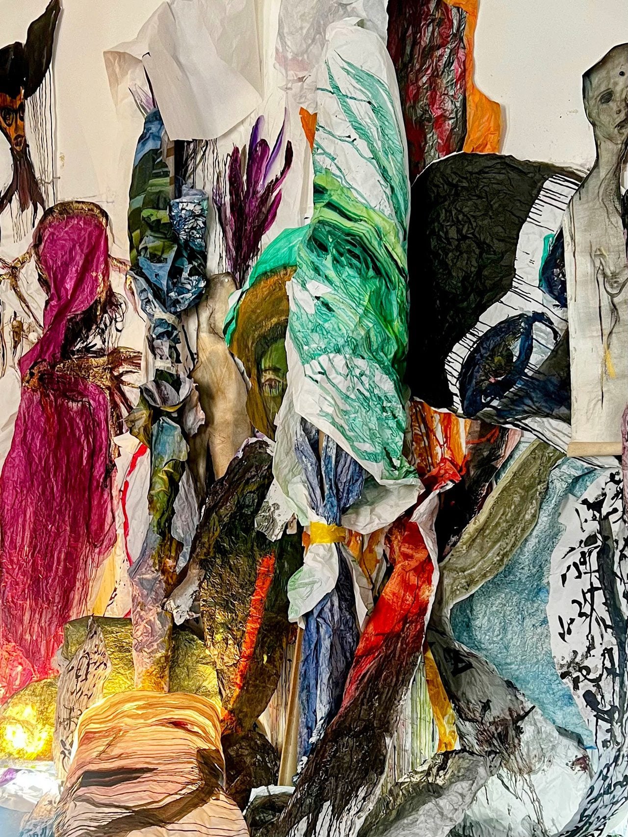 קיר ענק, מעין כותל, חותך אלכסונית בחדות את החלל המרכזי, כשעליו שכבות צפופות של ציורים יפים ונוקבים: דמויות גרוטסקיות, מפלצתיות שחורות המוארות דרמטית מאחור. הנייר ושימושו במיצב, הופך לאלמנט מרכזי: בין ענן ענק של נייר מכווץ, המרחף בחלל המשני, לבין שרשראות נייר עליהם רשומות מילות תלושות מן המציאות.