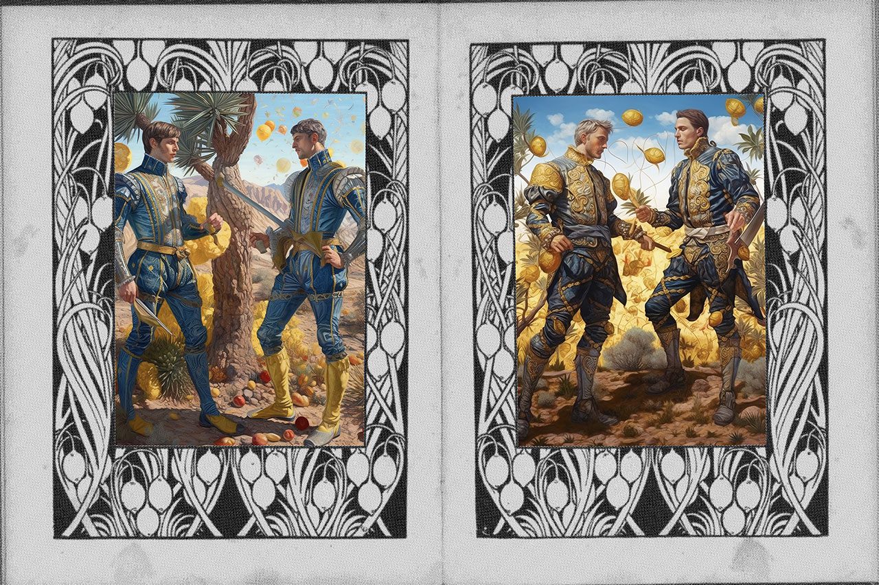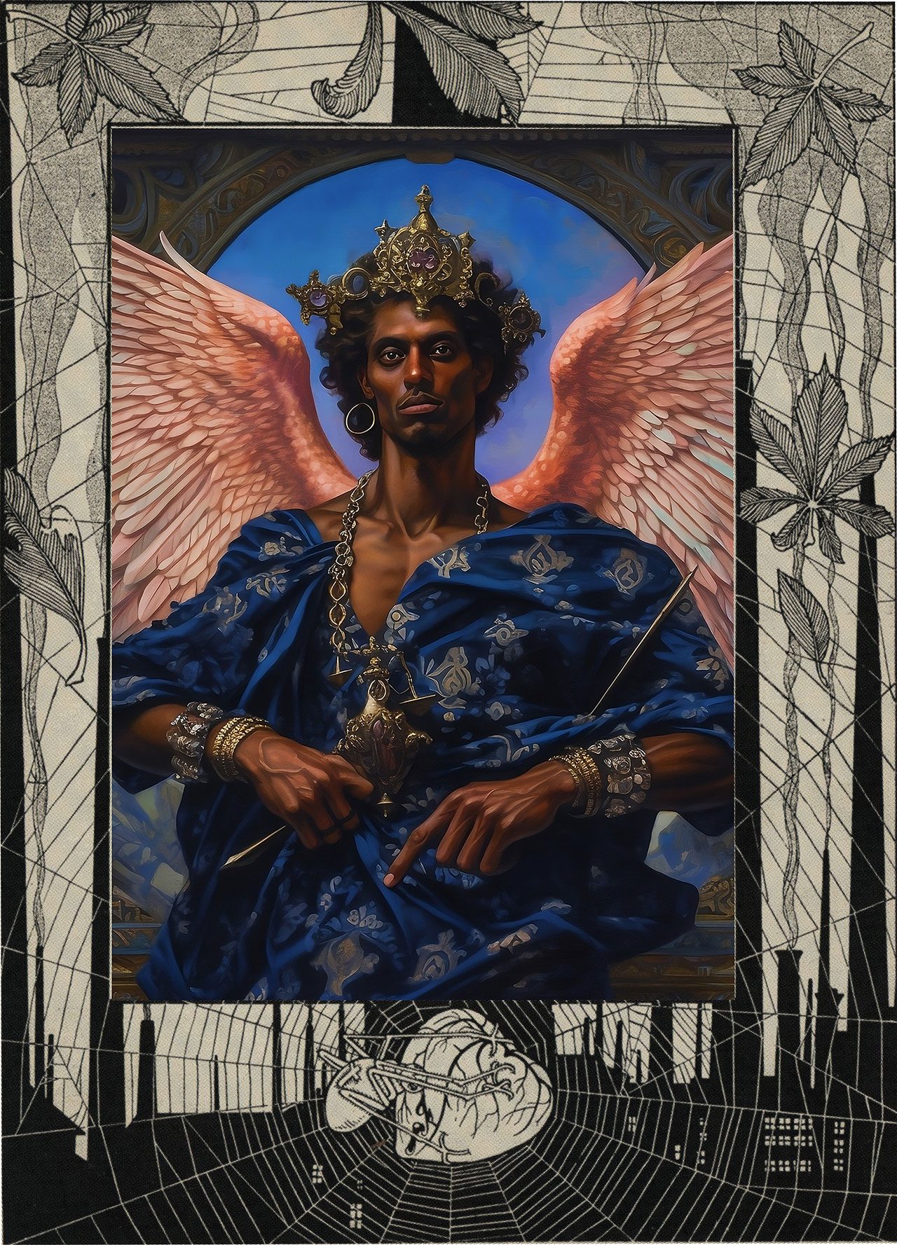 ״הדימויים שחוללו יחד דוד והבינה המלאכותית הם ביטויים של תרבות עכשווית המהדהדת פרקים בתולדות האמנות והעיצוב והתרבות״, כותבות גלית גאון ותום כהן, אוצרות התערוכה. ״היצירות מאתגרות את המחשבה על היסטוריה אמיתית ומזויפת דרך מפגשים בלתי אפשריים: מלאכים בדמות הבארוק משובשים כצילומי אופנה עדכניים, עטופים מסגרות אר־נובו של אפרים משה ליליין ושזורים במפות אזוריות, קומיקס ודינוזאורים, מיתולוגיה ויתושים, דארק אייטיז ותחריטי התנ״ך, רשימת משימות בין תקרות מפוארות של מקדש אפשרי. כל אלו שלובים זה בזה, ממלאים את קירות הגלריה ועוטפים את הגוף הלובש, מתעקשים על הטמעות מלאה בין יופי וכיעור, בין הגבוה והנמוך, בין המרחב לגוף ובין האמנות לחיים עצמם״.