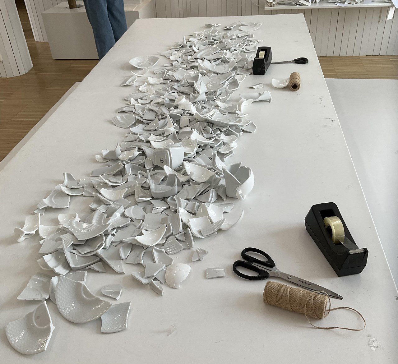 שתי עבודות מרגשות נעשו במיוחד למרכז (שתיהן מבוססות על שיחזור של עבודות קודמות והמשך של פרוייקטים מתמשכים), ובצורה זו או אחרת הן נוגעות כמובן בנו. הראשונה היא שולחן ובו כלים ביתיים שבורים. אונו מזמינה את המבקרים לתקן את השבור ולכתוב כמה מילים למחשבה על השבור והשלם, על הרס ועל בניה מחדש.