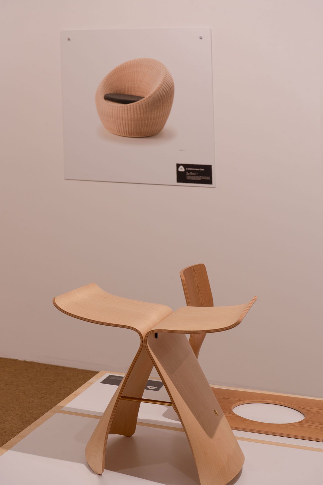 בין אלה מוצגים, בין היתר, שרפרף בטרפליי, שנוצר ב־1956 ונמנה על האוסף הקבוע של מוזיאון המטרופולין מאז 1958, ומושב זאיסו שנועד להנחה על מחצלות הטאטאמי. עיצובים מסוגו היו מוכרים גם בתקופת אדו, אך בגרסתו המעודכנת מ־1963, נעשה שימוש בחומרים ובטכניקות שנועדו לייצר אובייקט עכשווי ומתוחכם יותר שמותאם לרוח אוניברסלית. החלל הריק במרכזו נועד לשילוב כרית ומפחית את משקלו תוך שהוא תורם כך ממד פונקציונלי של קלות ניוד.