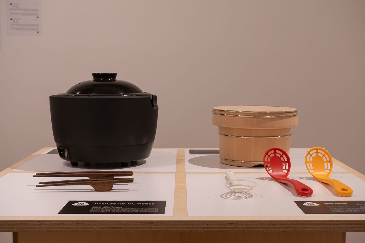 כמרכיב בסיסי בתזונה היפנית האורז מככב בתערוכה גם בעיצובן של קערות הגשה אישיות ובכלי הכנה נוספים, דוגמת סיר אורז חשמלי שנוצר ב־2018, כתחליף לסיר המתכת הפנימי שבתוך סיר חרס, שהיה בשימוש מסורתי במשך דורות רבים. ״אמנם סיר החרס נחשב לכלי אידיאלי לבישול אורז טעים, אך היה קשה לשלוט על הטמפרטורה שלו. הסיר החשמלי מאפשר זאת, וכך מבטיח הנאה מאורז טעים״. כלי אורז אחר הוא כזה שנוצר ב־2001 ומשמר את העיצוב המסורתי מתקופת אדו. הכלי הנאה משלב כבעבר עץ וחישוקי ניקל דקים וכסופים, אך טכניקת היישום והפרופורציות שלו הותאמו לזמננו.