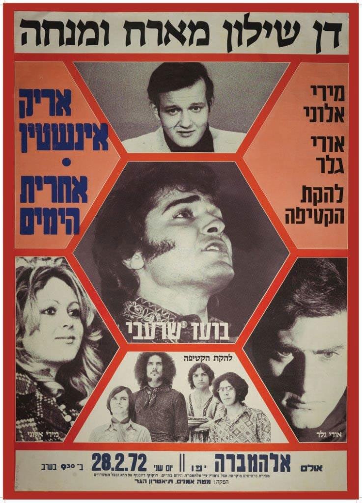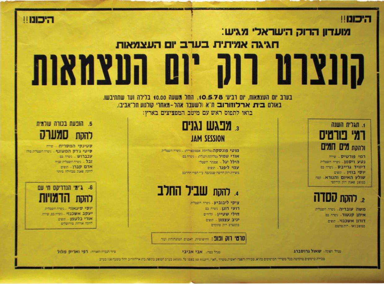 ערן: הכרזה הזו שיאיר מזכיר היא חלק מסדרת מופעים שיצר שאול גרוסברג, שגם עיצב את הכרזות. מבחינה עיצובית הן די דלות אבל המידע שיש בהן סופר חשוב בהבנה של הרוק בשנות השבעים
