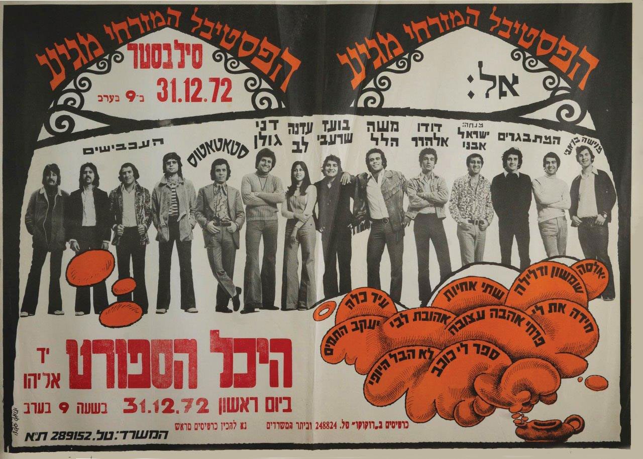 ערן: אין ספק שעיצוב הכרזה המקומית הושפע בעיקר מהיכולות הטכנולוגיות. ככל שאלה התקדמו והשתכללו, כך גם הכרזה היתה מורכבת יותר. תחילה היו רק טקסטים, אחר כך נוספו צילומים והאפשרויות הלכו והתפתחו. ההשפעה של העיצוב העולמי השפיע גם היא על עיצובי הכרזות והן מתכתבות היטב עם מה שקרה בפופ העולמי באותן שנים