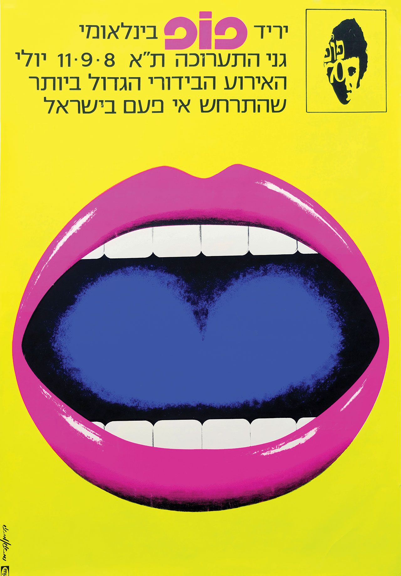 עוד דוגמה, כרזה נפלאה שעיצב המאייר דני קרמן ליריד פופ בינלאומי שהתקיים בגני התערוכה בשנת 1970 (עמוד 176 בספר). מראה בצורה נפלאה איך העיצוב העולמי זולג לעיצוב המקומי ועדיין יש בו משהו כל כך מקומי