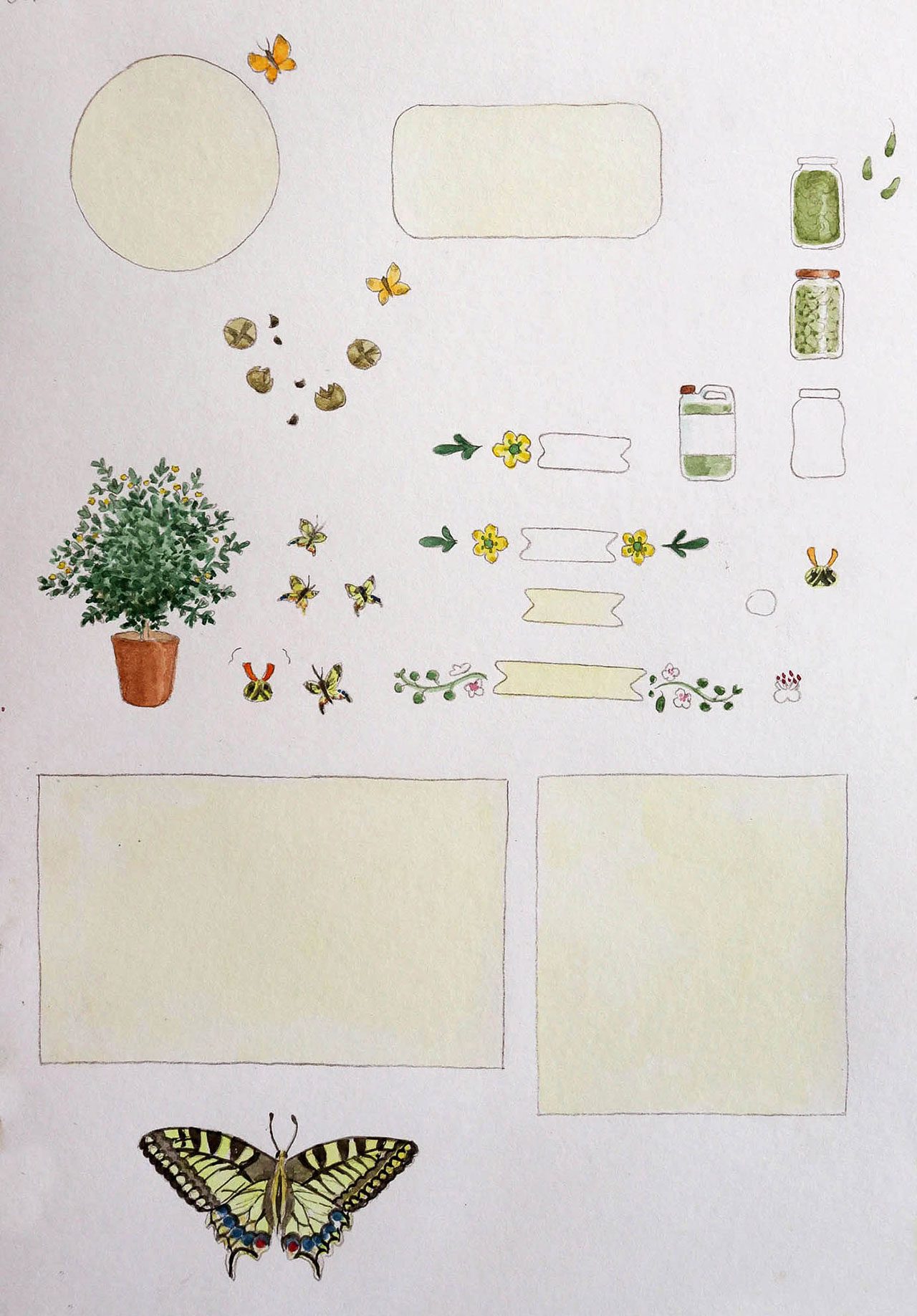 בכל שנה אני בוחרת נושא שילווה את הלוח (גידול ביתי, עצים, קיימות וכו׳) וגם יצור שילווה את כל הדפים (צב, קיפוד, חיות גינה). לאחר שהתוכן מחולק לפי החודשים אני מתחילה במלאכת האיור. האיורים נעשים בסגנון של איור בוטני – איור מתוך התבוננות בפרטי הצמח, מתוך כוונה שיהיה מזוהה וגם מתוך מתן דגש על מאפיינים מסויימים בהתאם לתוכן. האיור מתחיל בציור קו בעפרונות צבעוניים, ולאחר מכן מתמלא בצבע מים.