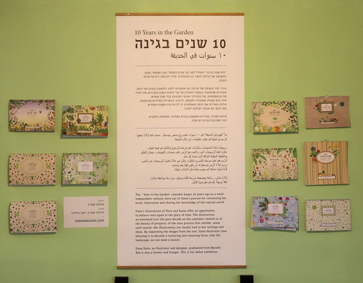 בימים אלה אני מציינת עשר שנים לפרוייקט לוח שנה בגינה, ולכבוד האירוע יוצאים גם האיורים המקוריים אל האור, ומוצגים בתערוכה ״10 שנים בגינה״. כשם שכל המיזם גדל בצורה אורגנית גם התערוכה התהוותה בצורה אורגנית, והיא מוצגת במקום שהוא בית שני בשבילי – על הגג היפה והצומח של מוסללה, במרכז העיר ירושלים.