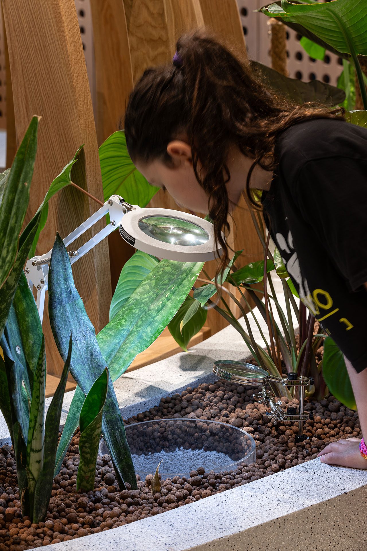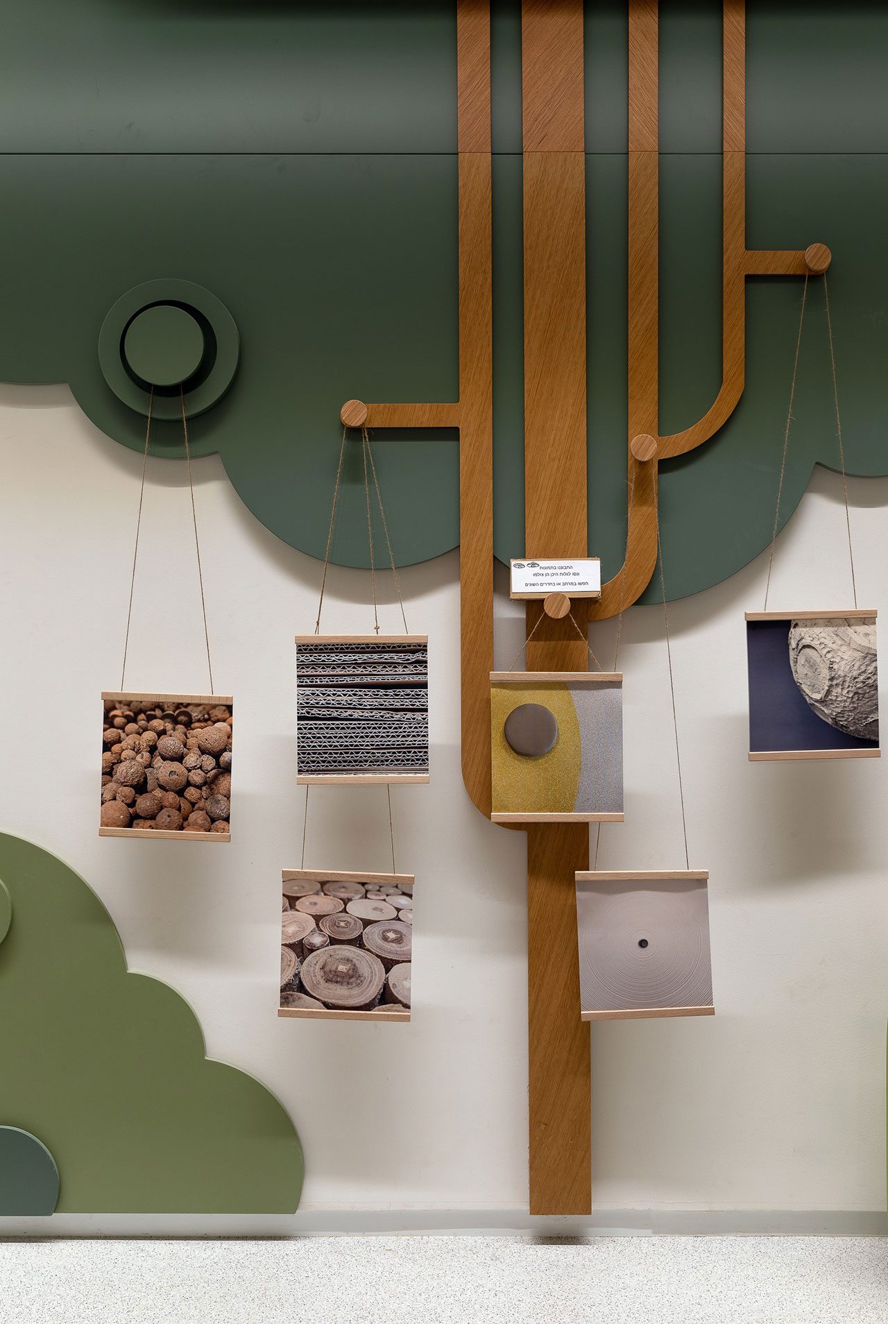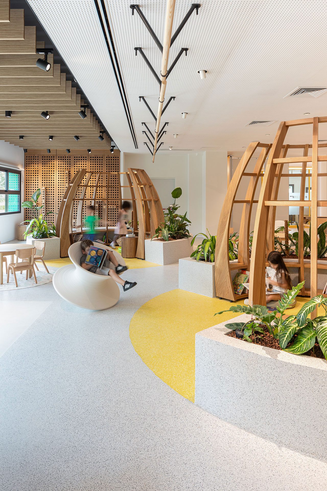 חללי הקומות אופיינו בצבעים משתנים, כשעיצוב האלמנטים, השילוט ופריטי הריהוט ששולבו בהם בוצע קאסטם־מייד, על פי מאפייני התוכן הספציפיים של כל קומה. בקומת הקרקע שולט הצבע הצהוב, וגן המדעים שבשטחה תוכנן בהתאם להנחיות של הצוות הפדגוגי. ״הגן הוא מרחב שמאפשר גמישות שימוש, וככזה מאופיין בדו־תכליתיות. כך לדוגמה, גינות נוי ששולבו בשטחו מהוות גם כלי לימודי להבנת מנגנוני הצומח בטבע, ארון אחסון פונקציונלי ורגיל לכאורה תוכנן תוך שילוב פונקציה משחקית, ומתקני משחק עוצבו ייעודית תוך שהם מאפשרים פירוק והרכבה כאמצעי לפיתוח כישורים יצירתיים״.