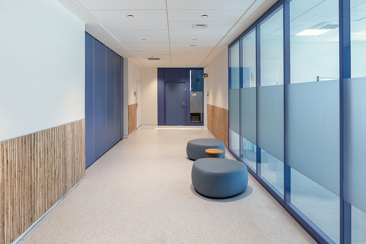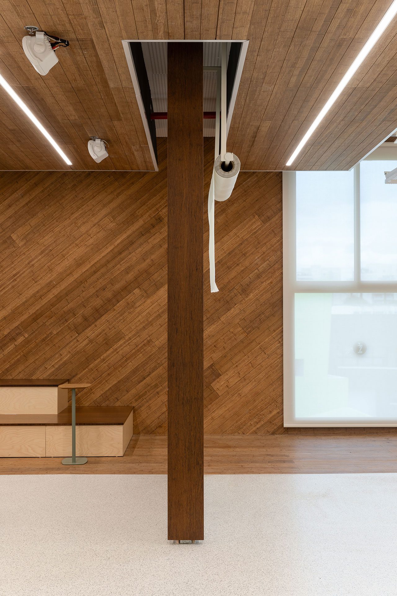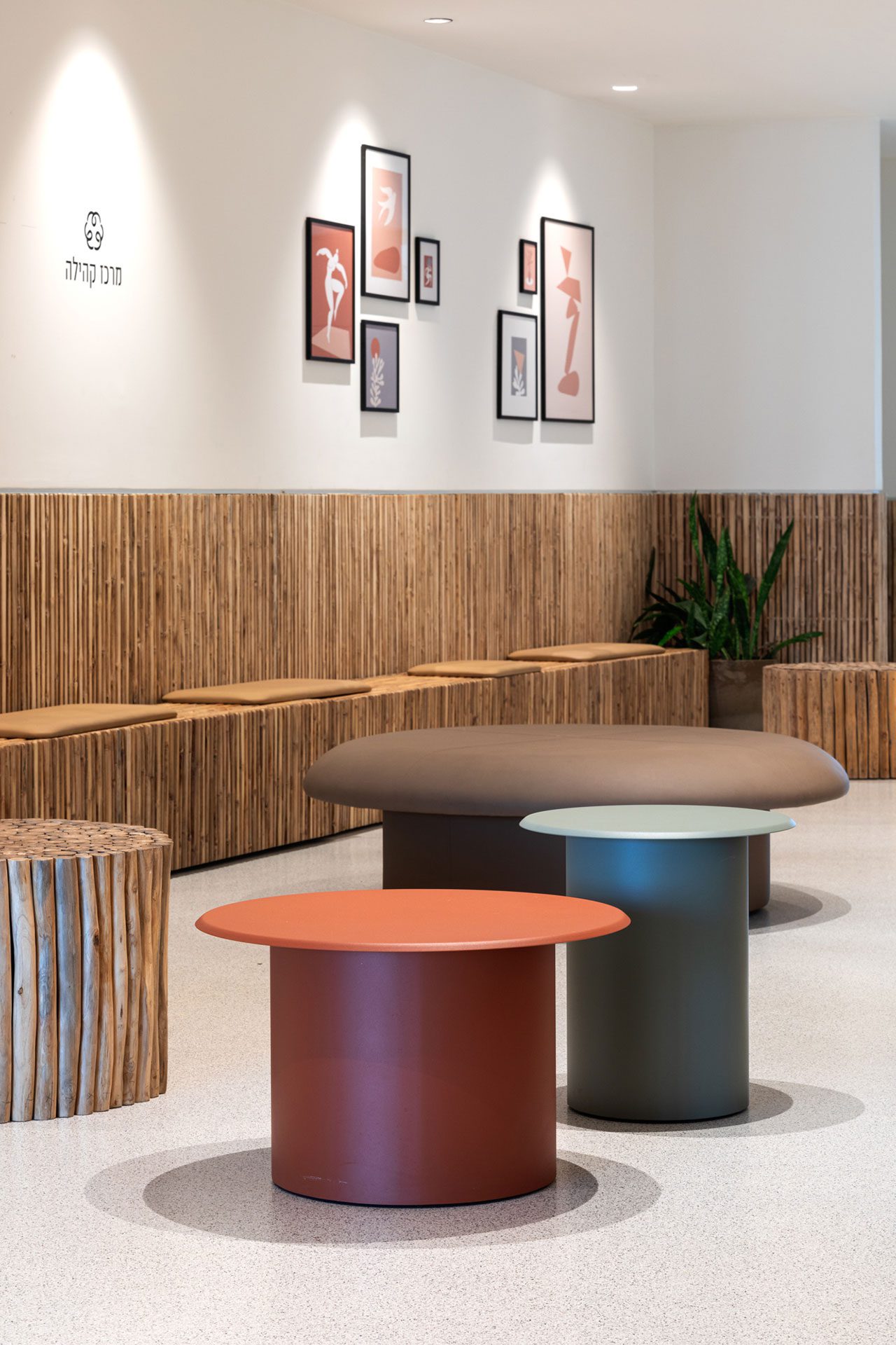 במישור החומרי החללים הציבוריים בקומות רוצפו ביציקת פוליאוריטן עמיד לשחיקה, ולחיפוי השליש התחתון של קירותיהם נעשה שימוש בלוחות קני במבוק. בכל חלל כזה, ובהתאמה לצרכי הקומה והפונקציה שהיא משרתת, שולבו באזורים הציבוריים מקומות ישיבה מגוונים המאפשרים יצירת אינטראקציות בין השוהים והממתינים בהם: ספסלים (בכלל זה כאלה שניתנים להצבה משתנה), מושבים מרופדים, פופים ובולי עץ כמושבים. בקומת הקהילה/חוגים ובקומת השחמט והקיימות הוצבו גם שולחנות וכיסאות.