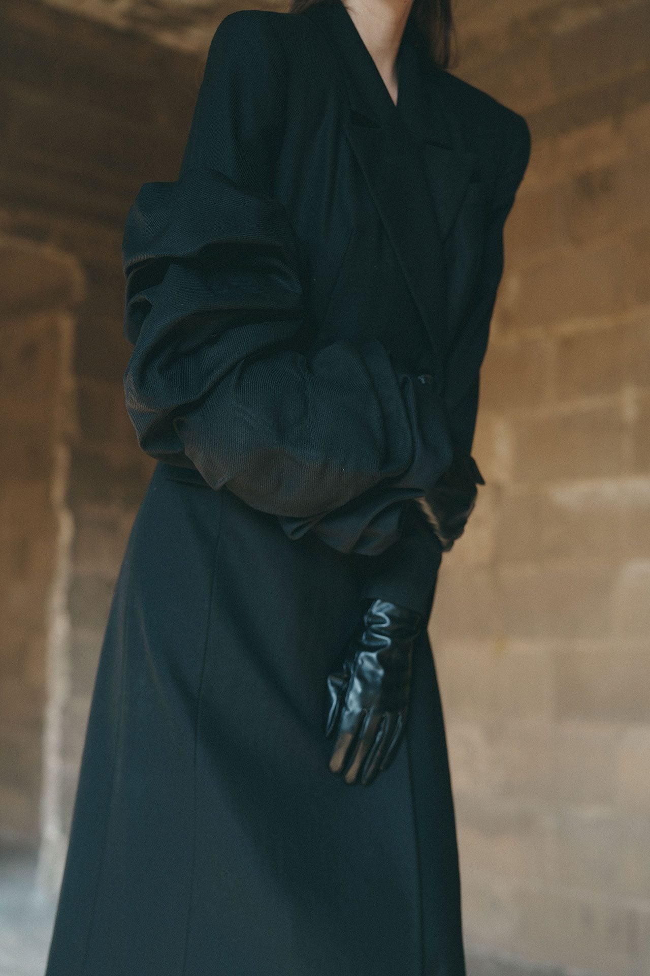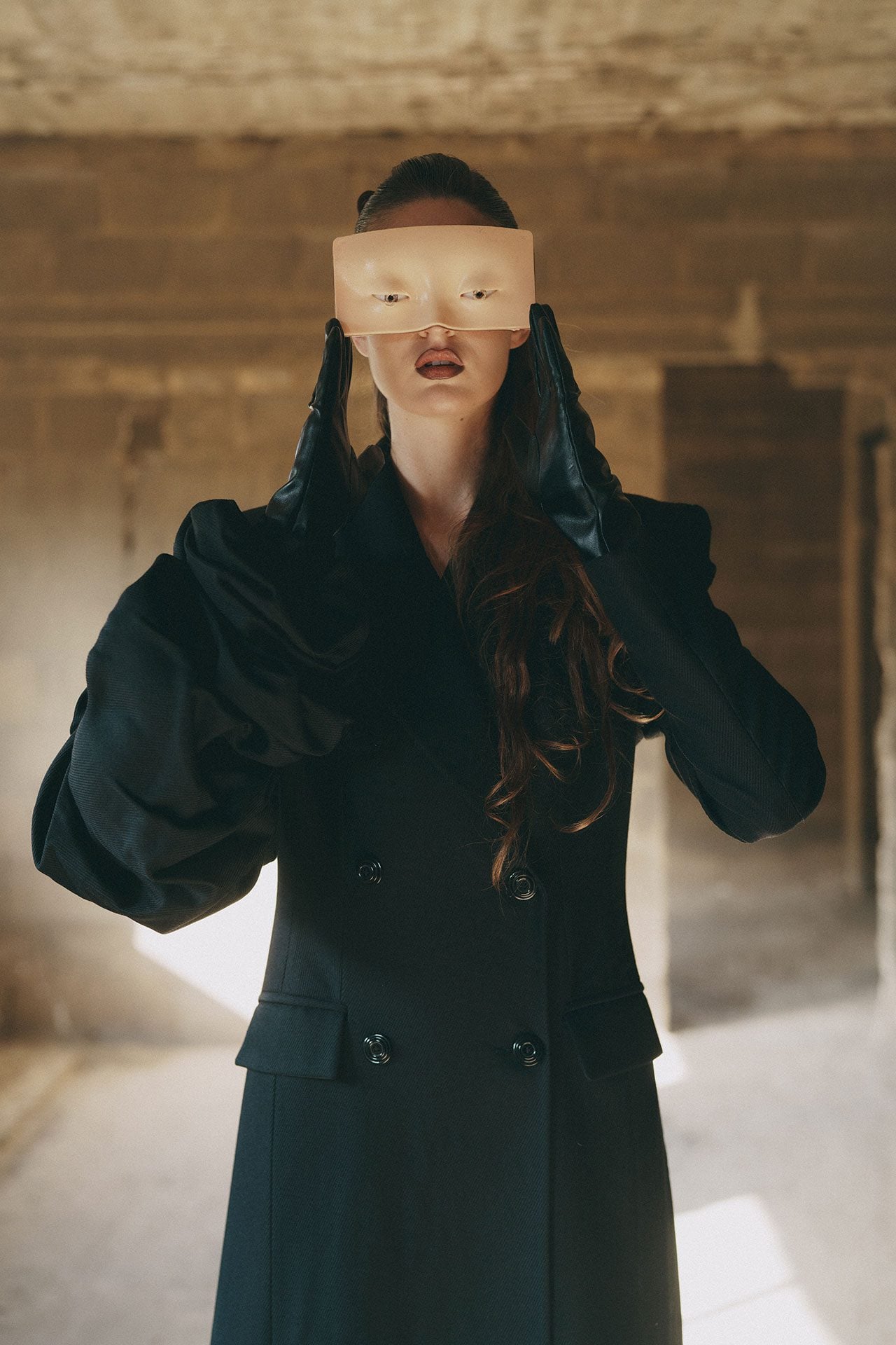 שחר: צמר הוא חומר שאפשר לפסל איתו ולהגיע באמצעותו לטכניקות שלא אפשריות בבדים אחרים. בחרתי בצמר כי הוא חומר טבעי ואיכותי שמאפשר עבודה עם טקסטורות מורכבות ויוצר נפח ועומק בעיצובים. הוא משלב חוזק וגמישות, מה שמתאים לרעיון הדואליות שאני חוקר בקולקציה. בנוסף, השימוש בצמר מחבר אותי לחייטות המסורתית, מה שמאפשר לשלב טכניקות קלאסיות בעיצובים מודרניים, תוך שמירה על אסתטיקה ופונקציונליות.