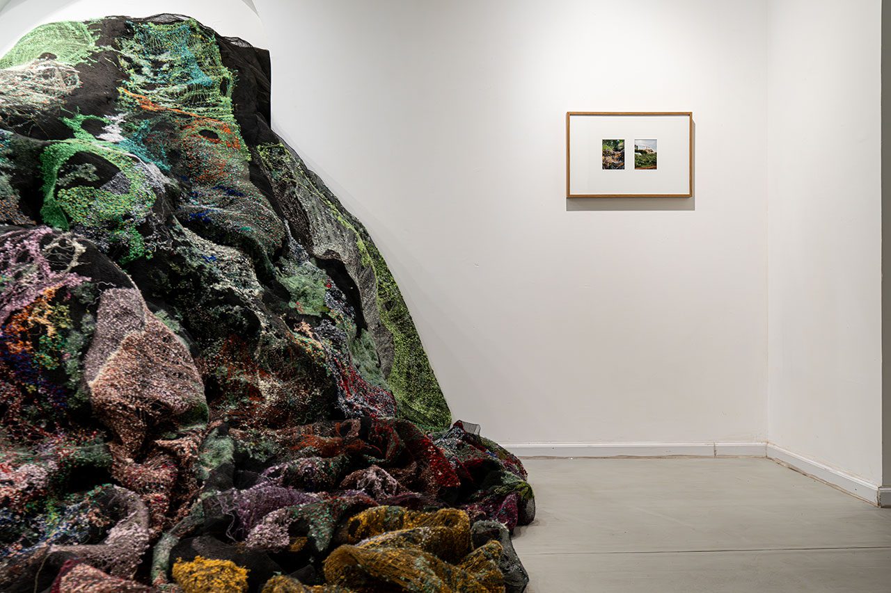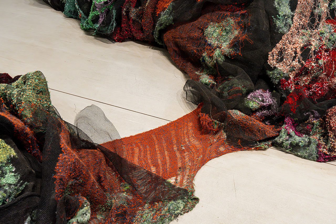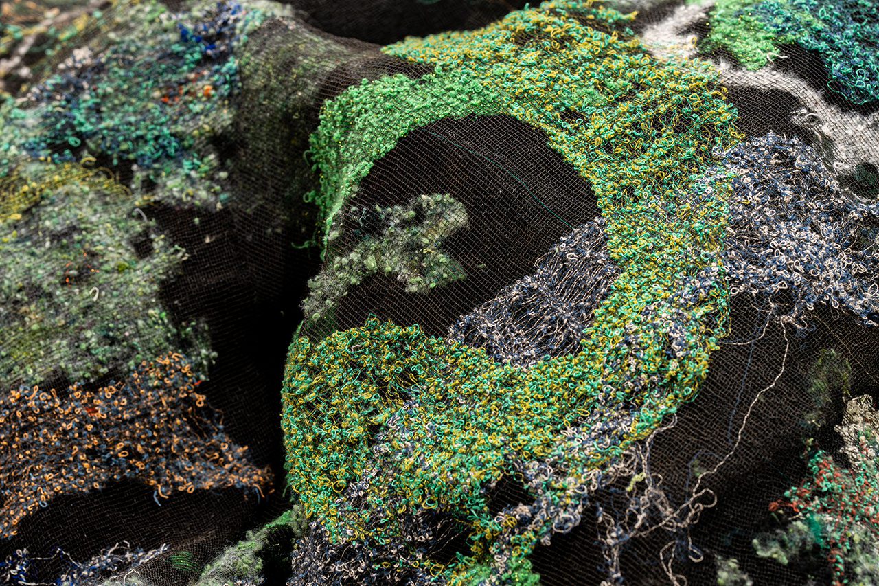 עבודת ההצבה תלויית החלל מבקשת להאיר את הגבול שבין הרס ובנייה מחדש ובין פנים לחוץ, בפנייה של העבודה אל הקהל במרחב הציבורי. היא מורכבת משני חומרים טעונים במשבר: רשת חקלאית, המסמלת את משבר החקלאות, ושאריות סריגים, המסמלים את משבר הטקסטיל. אלה הם שני משברים שאני מכירה מקרוב כבת של חקלאי וכמי שעוסקת בתחום הטקסטיל. דרך הפעולה האמנותית, בפרימה ובליבוד, נבחנת פעולת השיקום.