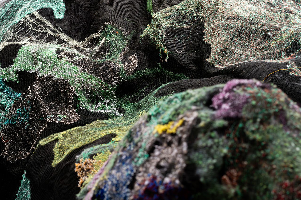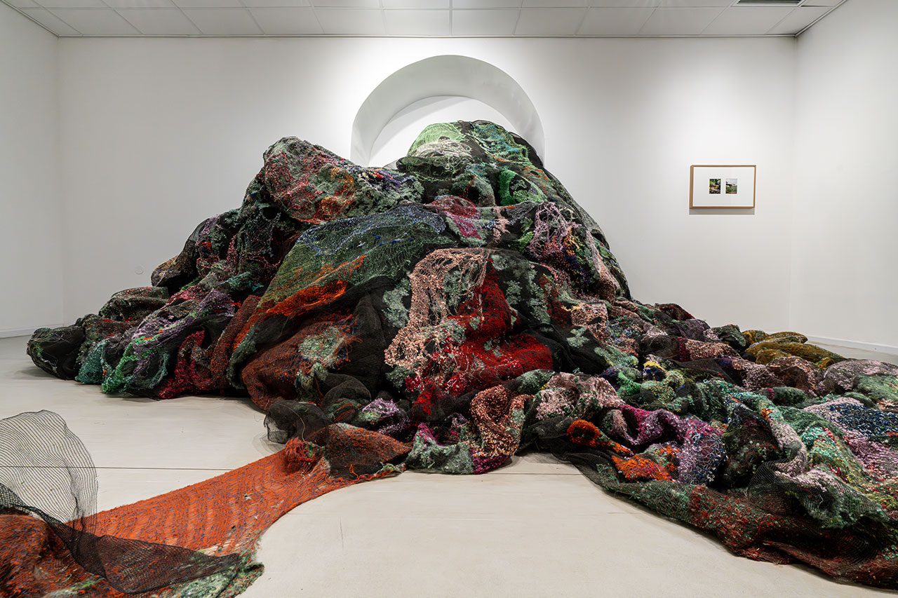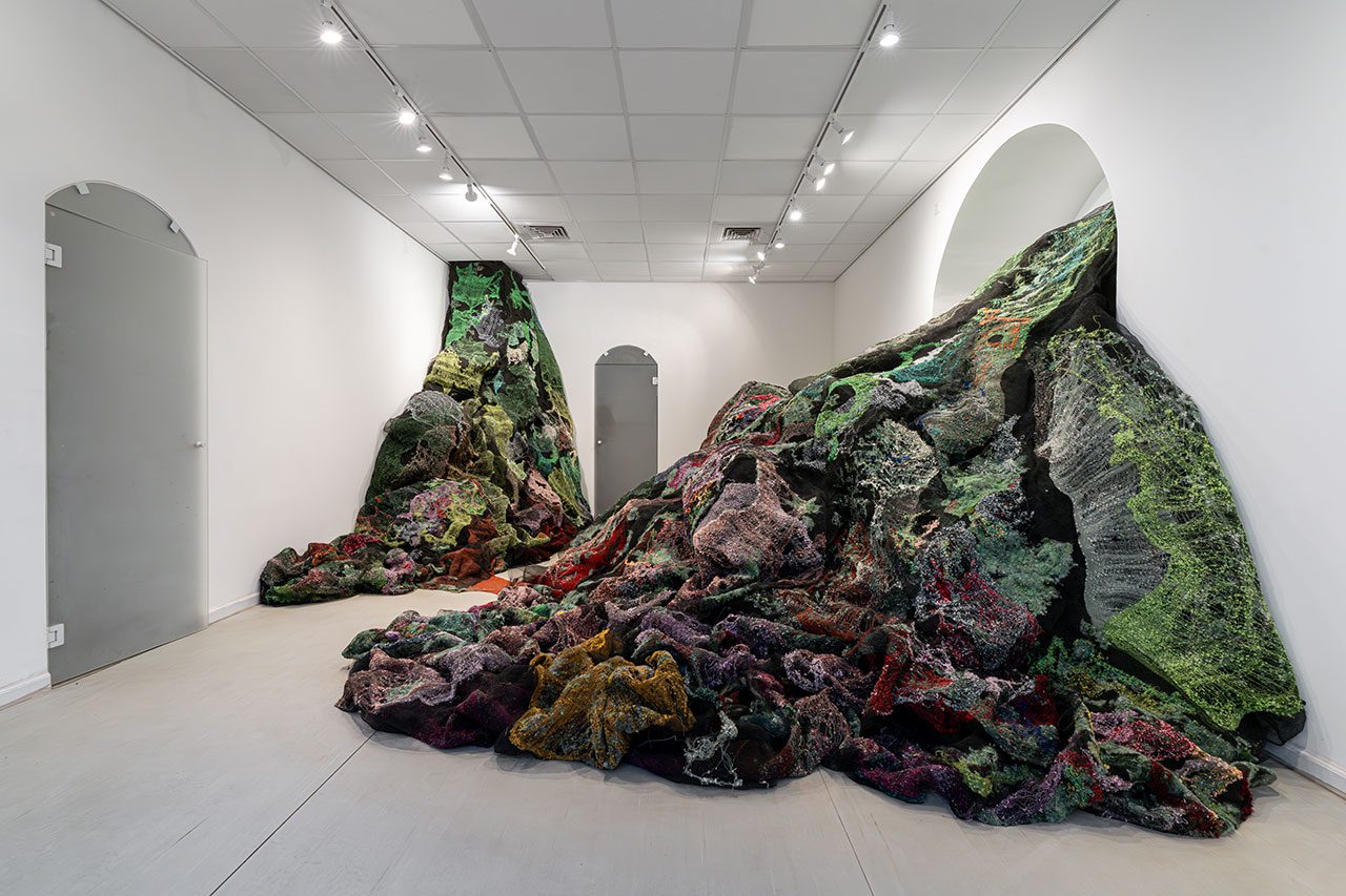עבודת ההצבה תלויית החלל מבקשת להאיר את הגבול שבין הרס ובנייה מחדש ובין פנים לחוץ, בפנייה של העבודה אל הקהל במרחב הציבורי. היא מורכבת משני חומרים טעונים במשבר: רשת חקלאית, המסמלת את משבר החקלאות, ושאריות סריגים, המסמלים את משבר הטקסטיל. אלה הם שני משברים שאני מכירה מקרוב כבת של חקלאי וכמי שעוסקת בתחום הטקסטיל. דרך הפעולה האמנותית, בפרימה ובליבוד, נבחנת פעולת השיקום.