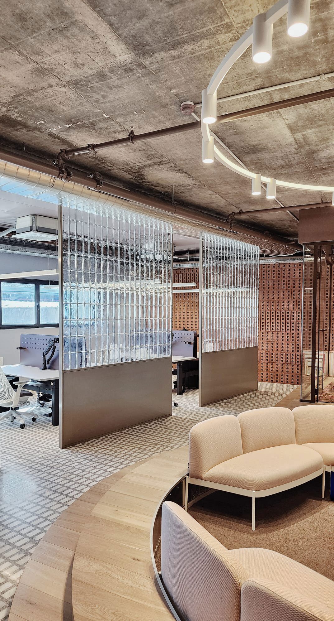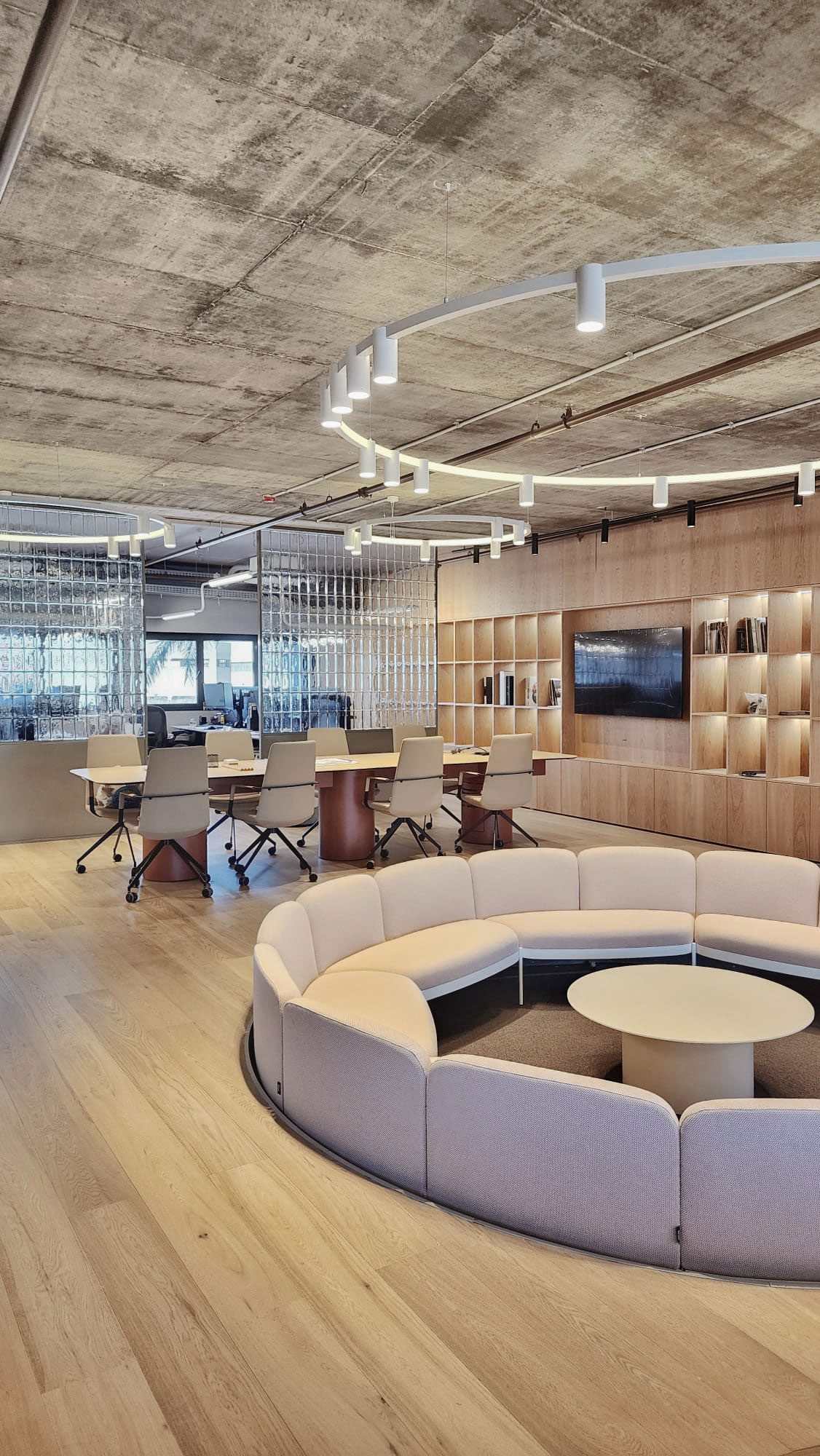 דפנה: המשרד תוכנן ברמת הצוות מאחר והוא סטודיו שניזון מהמשרד הראשי, ולכן המחשבה הייתה לייצר חלל שעובד פנימה, מעוגל, מזמין