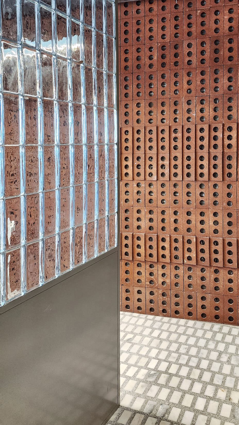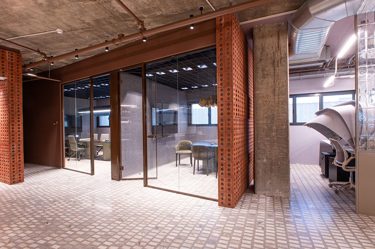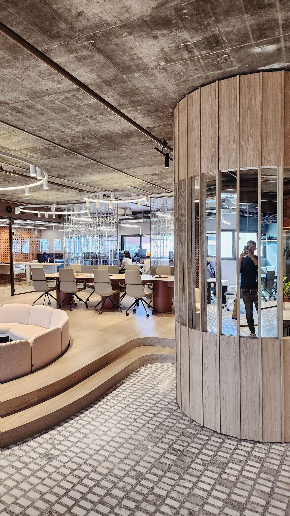 דפנה: במשרד הקיים הייתה בעיה של אקוסטיקה כשיש פגישות זום מרובות, אז ייצרנו תאי פגישות על מנת לפתור את הנושא. לקחנו חומרים שקיימים במשרד החדש כמו רצפת טרצו, והקפצנו אותה למשהו יותר אמנותי, שילבנו בה אריחי שיש.