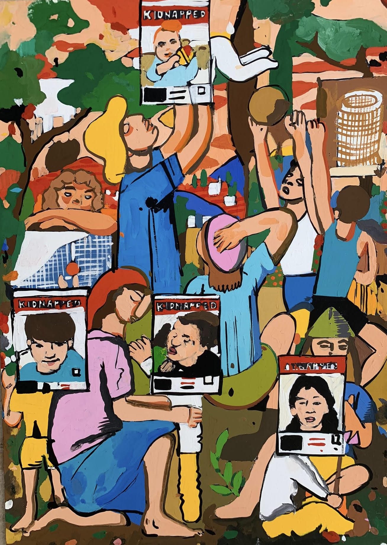 אמילי כתבה בהודעת אינסטוש שהיא האשה הכי מאושרת בעולם. הדיסוננס הזה בין מה שהילדה הזאת עברה, הגיהנום, לבין החיוך והאושר שראינו – הביא אותי לצייר אותה ככה. כי מאחורי התמונות והמילים יש ילדה שהייתה בשבי ואנחנו לא יודעים כלום, אז אני רוצה לנסות להעביר את הציור הזה והכותרת המתעתעת, שיורידו אותנו אל פני הקרקע