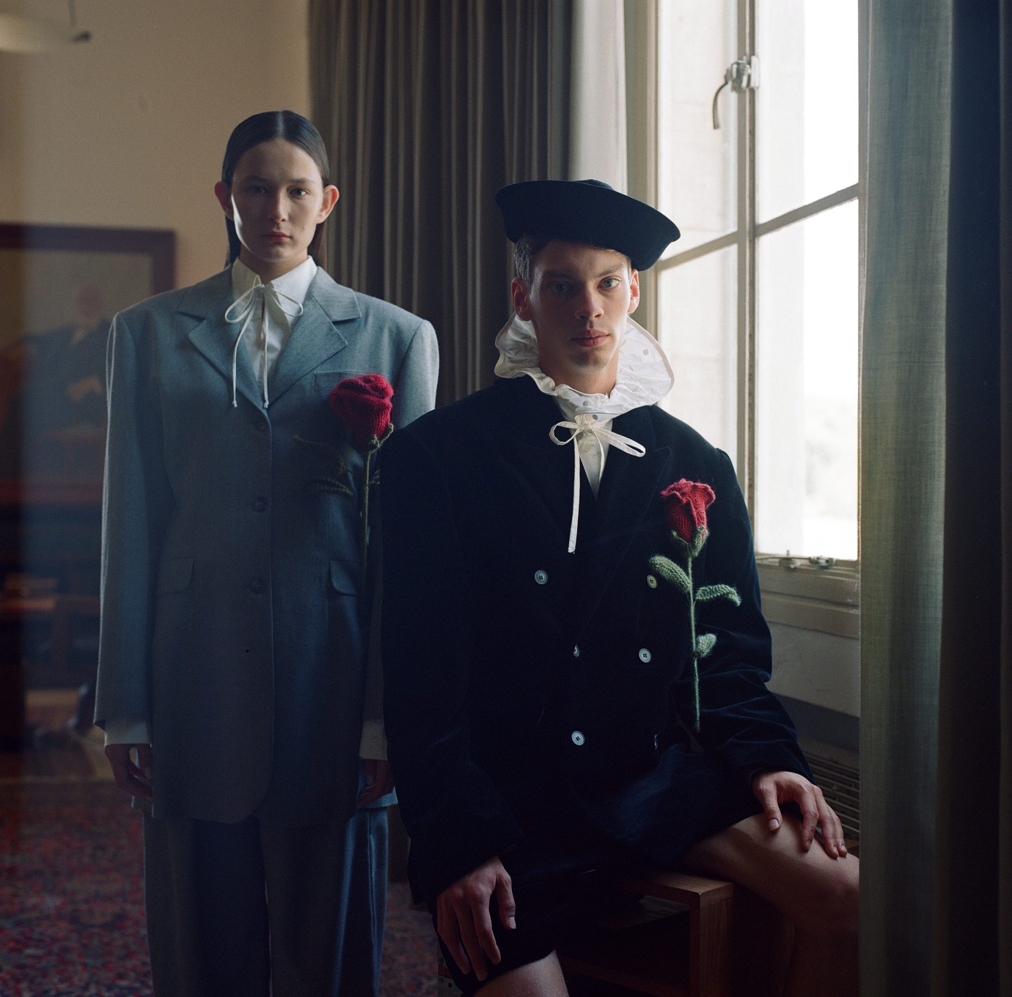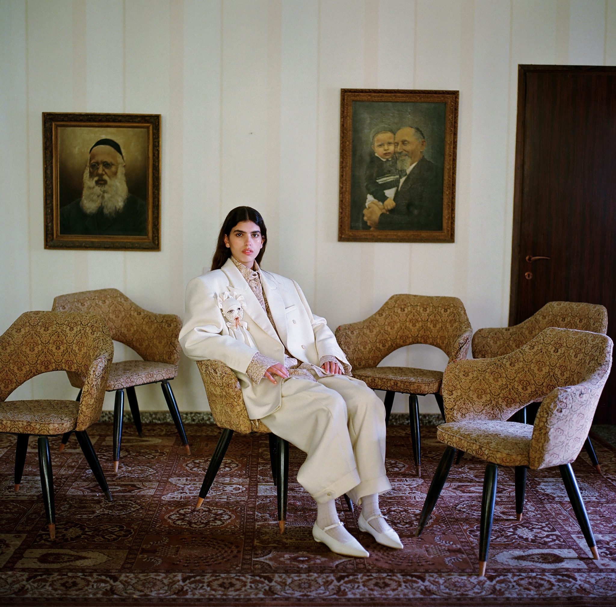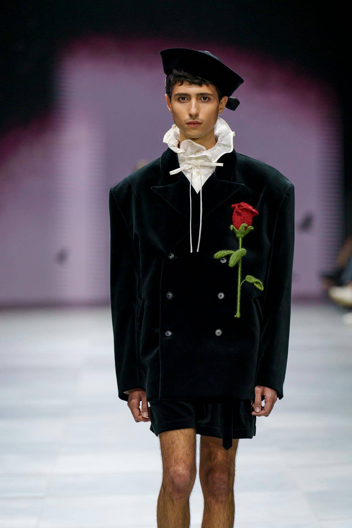 אהרון: נכון. אני מביע באמצעות אלמנטים סמליים שמשויכים לטקסים שונים מעולם הילדות שלי שהיה דתי ומנקודת המבט שלי היום. הגבולות המגדריים מטשטשים דרך צלליות של אוברסייז, חליפות מחויטות ושמלות שקווי הגוף מקבלים בהם פרשנות חדשה ושונה; בגדי גברים קלאסיים הופכים לבגדי נשים, ולהפך