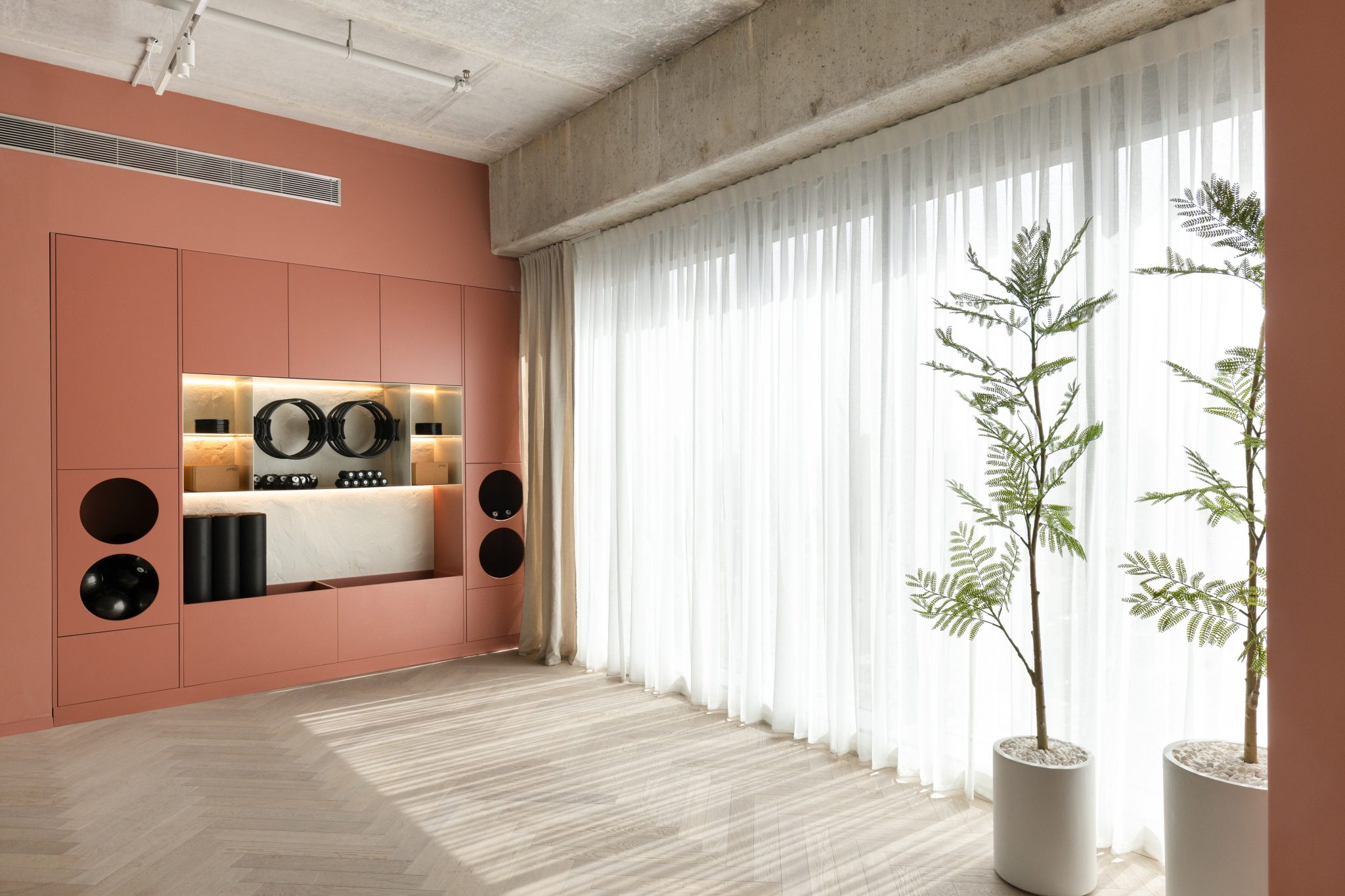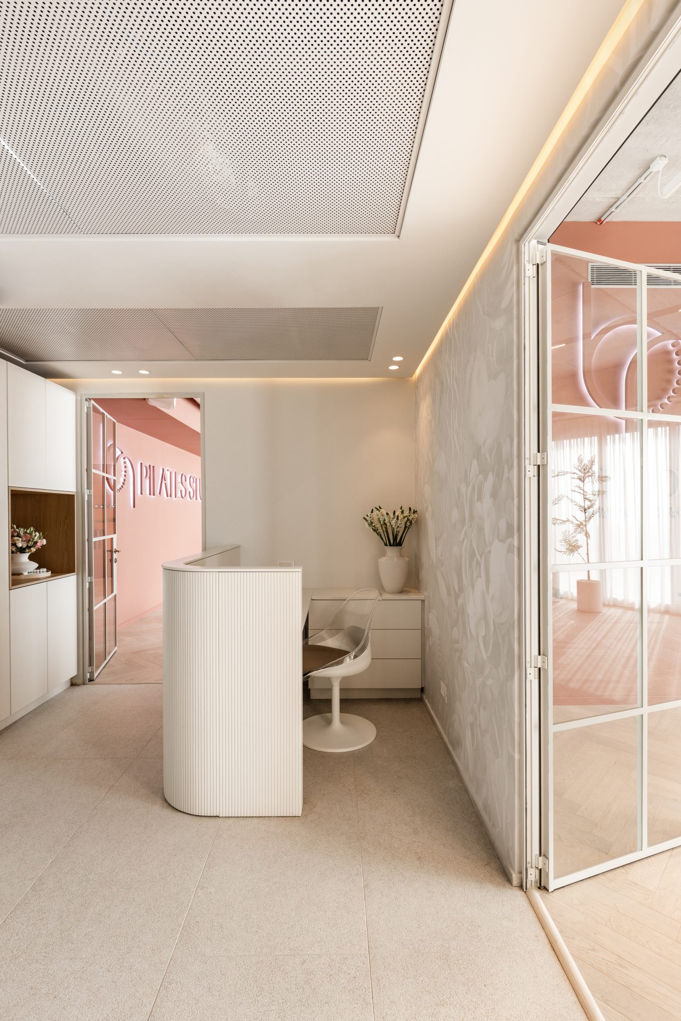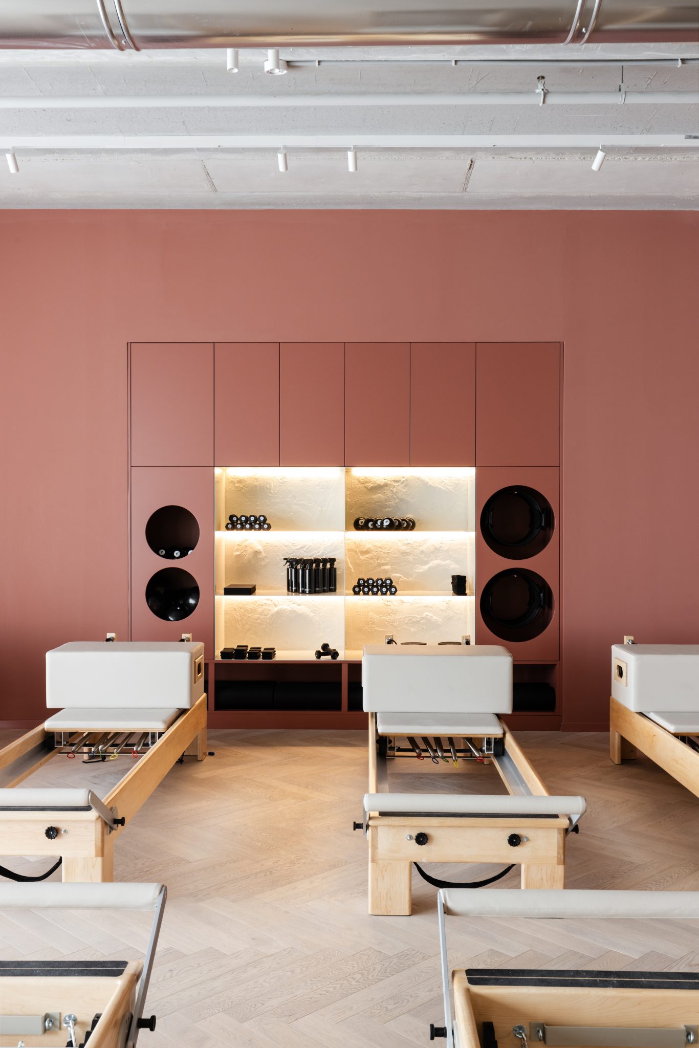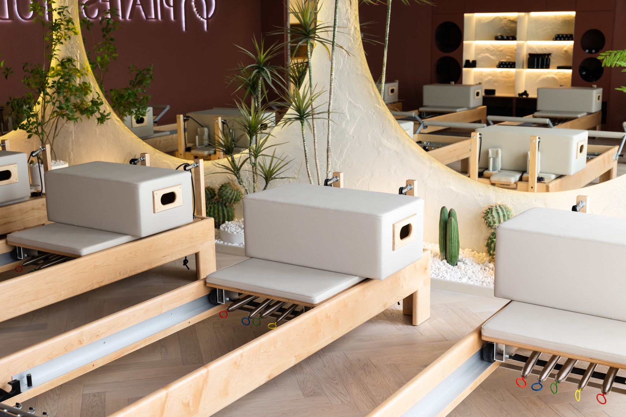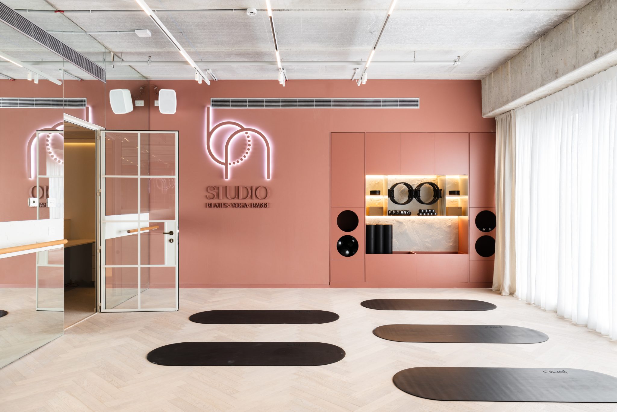 הסטודיו מאזן בין אלגנטיות לעוצמה, עם קיר כוח מחופה דמוי אבן גיר בעבודת יד, מראות עגולות עם תאורה נסתרת ושילוב צמחייה טבעית. כל אלמנט, כולל הציוד המותאם אישית לפילאטיס מכשירים, תוכנן בקפידה כדי לספק חוויית אימון נשית, רגועה ומקצועית, תוך שמירה על עיצוב שמייצר תחושת עוצמה ורכות.