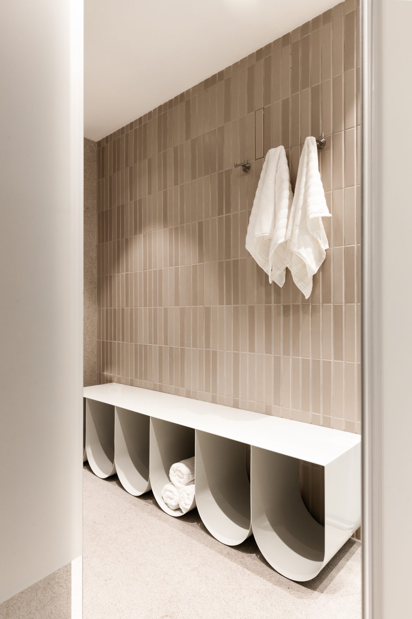 הפרויקט משלב חומרים טבעיים וקווים רכים, עם קירות מחופים דמוי אבן גיר בעבודת אמן, פרקט אלון מולבן וריהוט בהתאמה אישית. כל פרט בחלל – מהרצפה ועד גופי התאורה – עוצב בקפידה כדי לשדר שלמות והרמוניה. התקרה נותרה כתקרת בטון החושפת תעלות מיזוג תעשייתיות, שמוסיפות ניגוד מחוספס וחוזק בתוך הרכות האלגנטית.