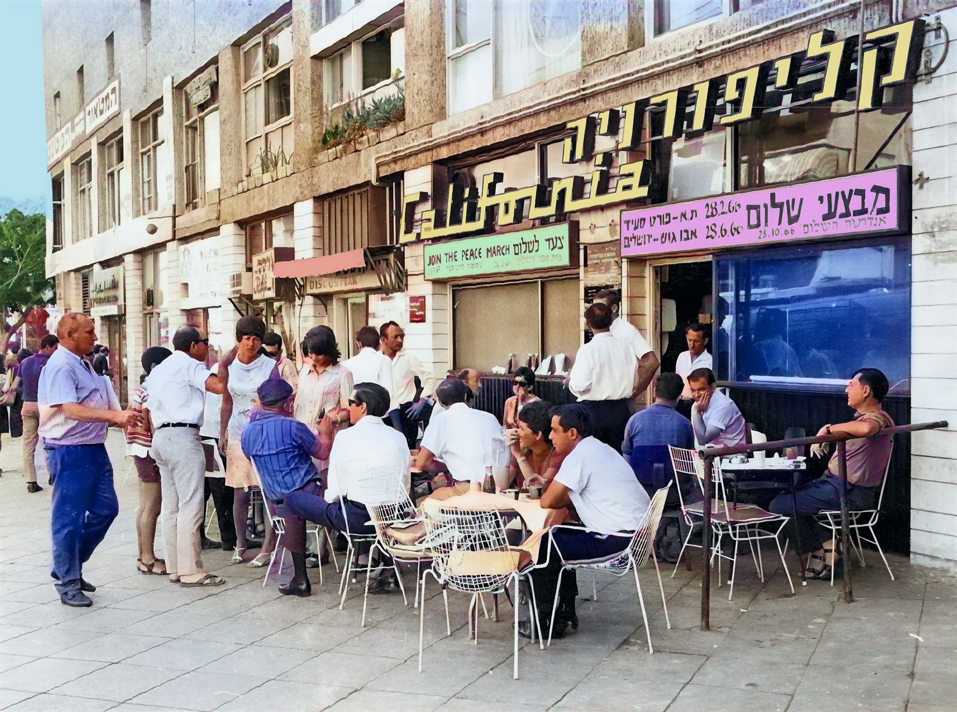 קפה קליפורניה. עיצוב תמונה: מאיה סמירה (צילום מקורי: ארכיון דן הדני / אוסף משפחת פריצקר / הספריה הלאומית)