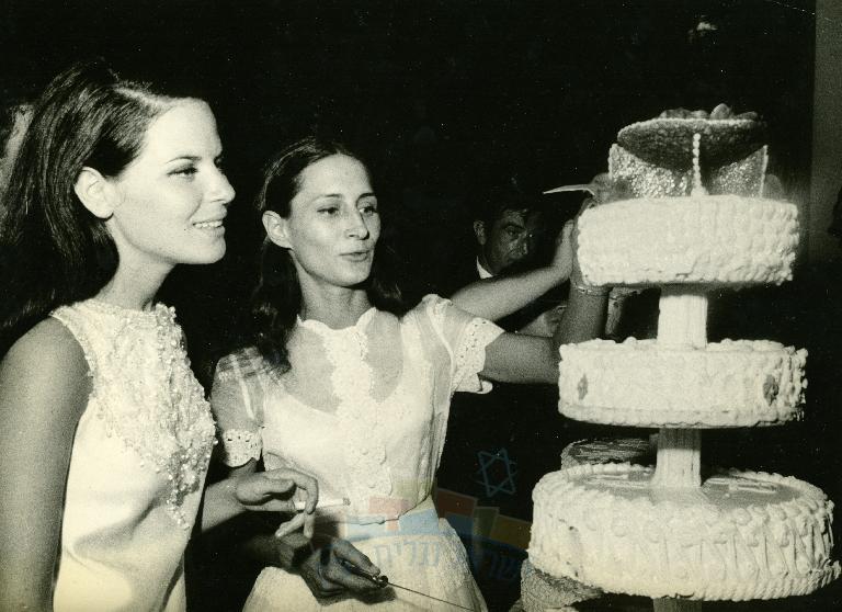 יעל דיין ואהרונה לבית מלכין ליד עוגת קומות ביום נישואיהן, תל אביב (צלם לא ידוע)