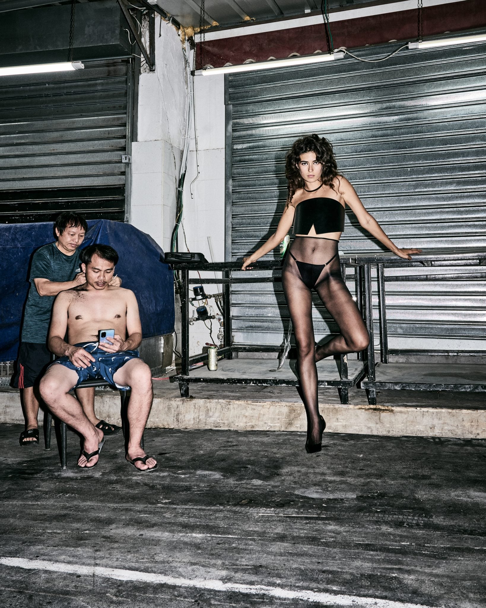 עוד צילום נעשה כחלק מהפקה למותג אביזרי עור, בשוק הכרמל בשעת לילה מאוחרת. הפריים תופס רגע ספונטני לגמרי – שני מקומיים באמצע תספורת ברחוב לצד הדוגמנית, מה שיוצר ניגוד מפתיע שממחיש את האקראיות והחיות שבצילום אופנה.