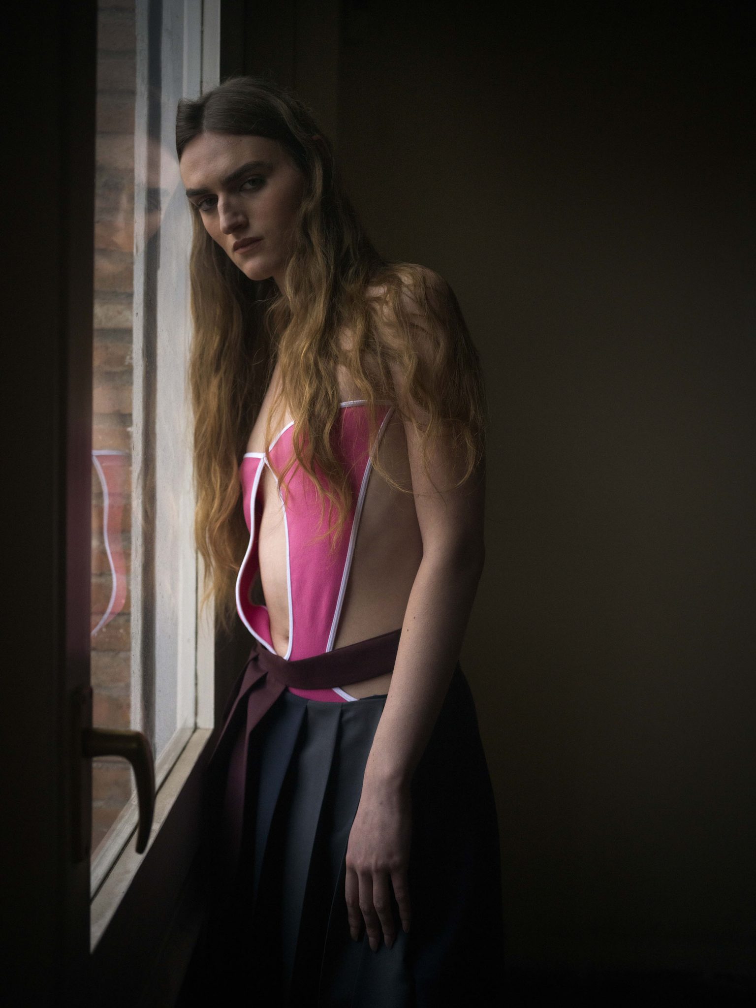 מציגה בתערוכה: צילום מתוך צילומי קולקציה חדשה של המעצב אהרון גניש, שצולמה בבניין היסטורי בחיפה, בחדר העבודה של מי שהיה מייסד חברת החשמל – פנחס רוטנברג. את הסטיילינג עשתה חיה וידר.