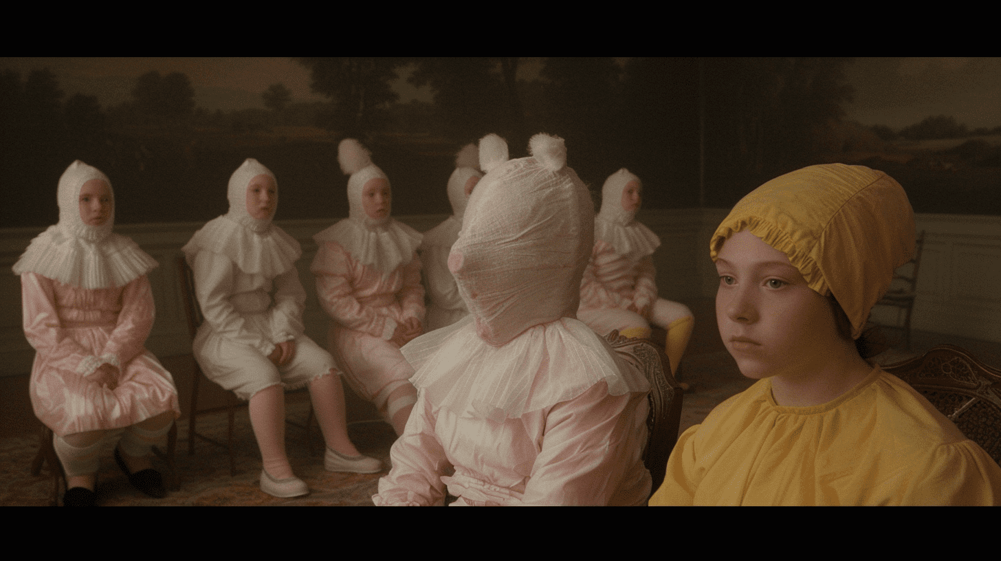 The Performance of Obedience: דימויים חזותיים מעולמות תיאטרליים־ילדותיים, החושפים את המחיר השקט של ציות. הילדות במסכות והפיל המחופש — דמויות שנולדו כדי לשתוק, לרצות, להופיע. היופי עטוף בפחד. הצבעים רכים — אבל האווירה לוחשת משהו אחר. מבטים כבויים. מבט אחד שמתעורר.