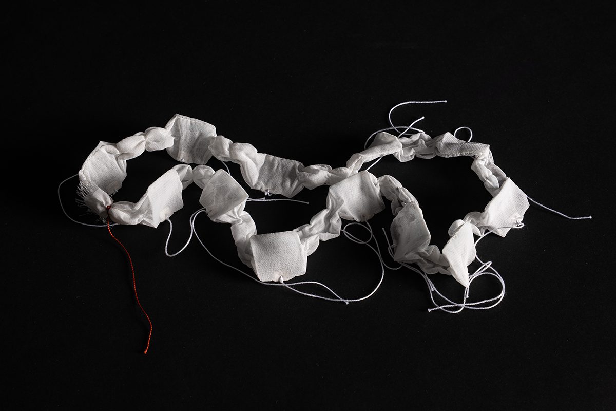 שרשראות המורכבות משקיקי תה שקופים חושפות את פעולת ההיספגות והשינוי לאורך זמן. החומרים עצמם רגישים לשינויי סביבה, סופגים ומגיבים, כפי שהגוף מגיב למציאות חיצונית.