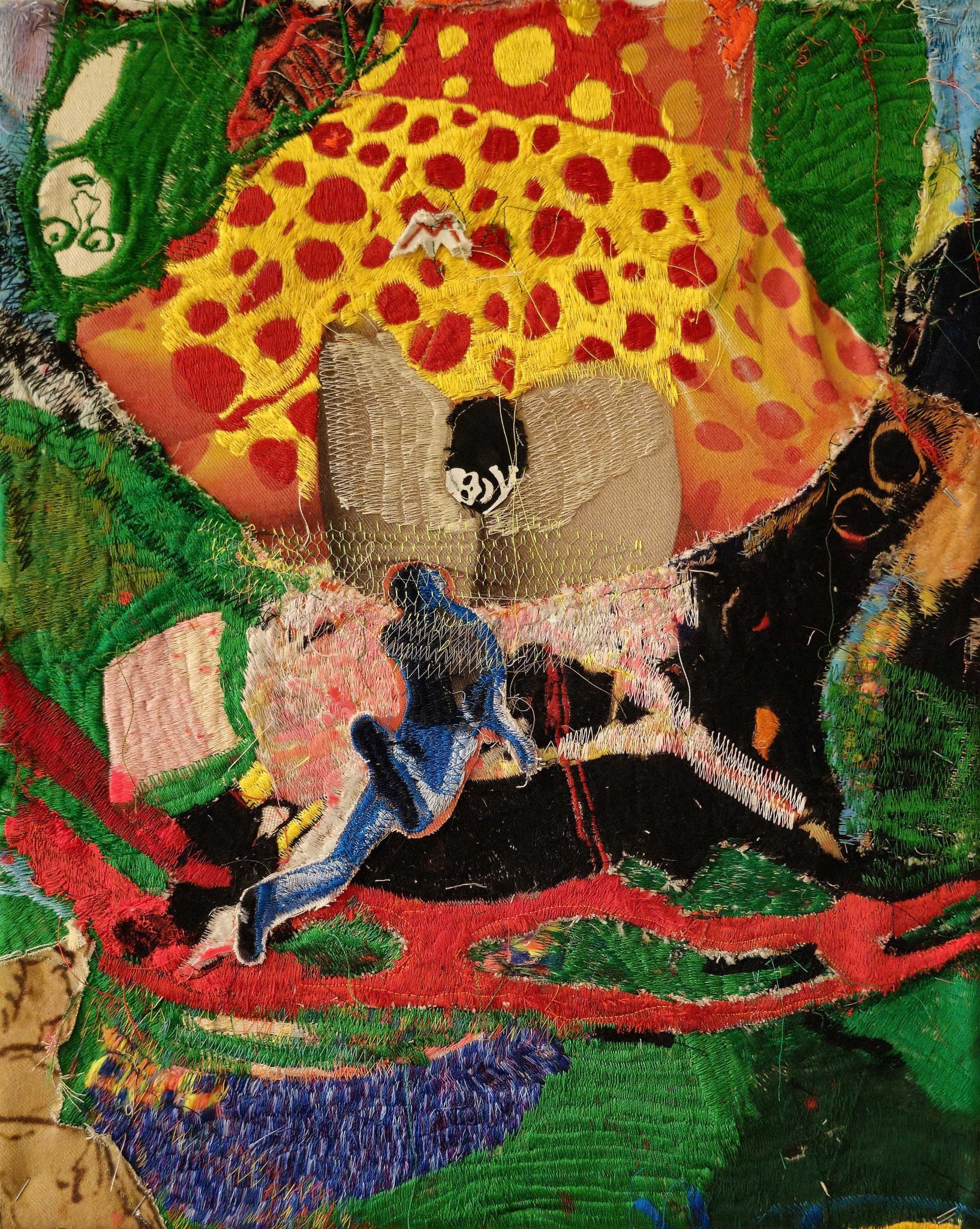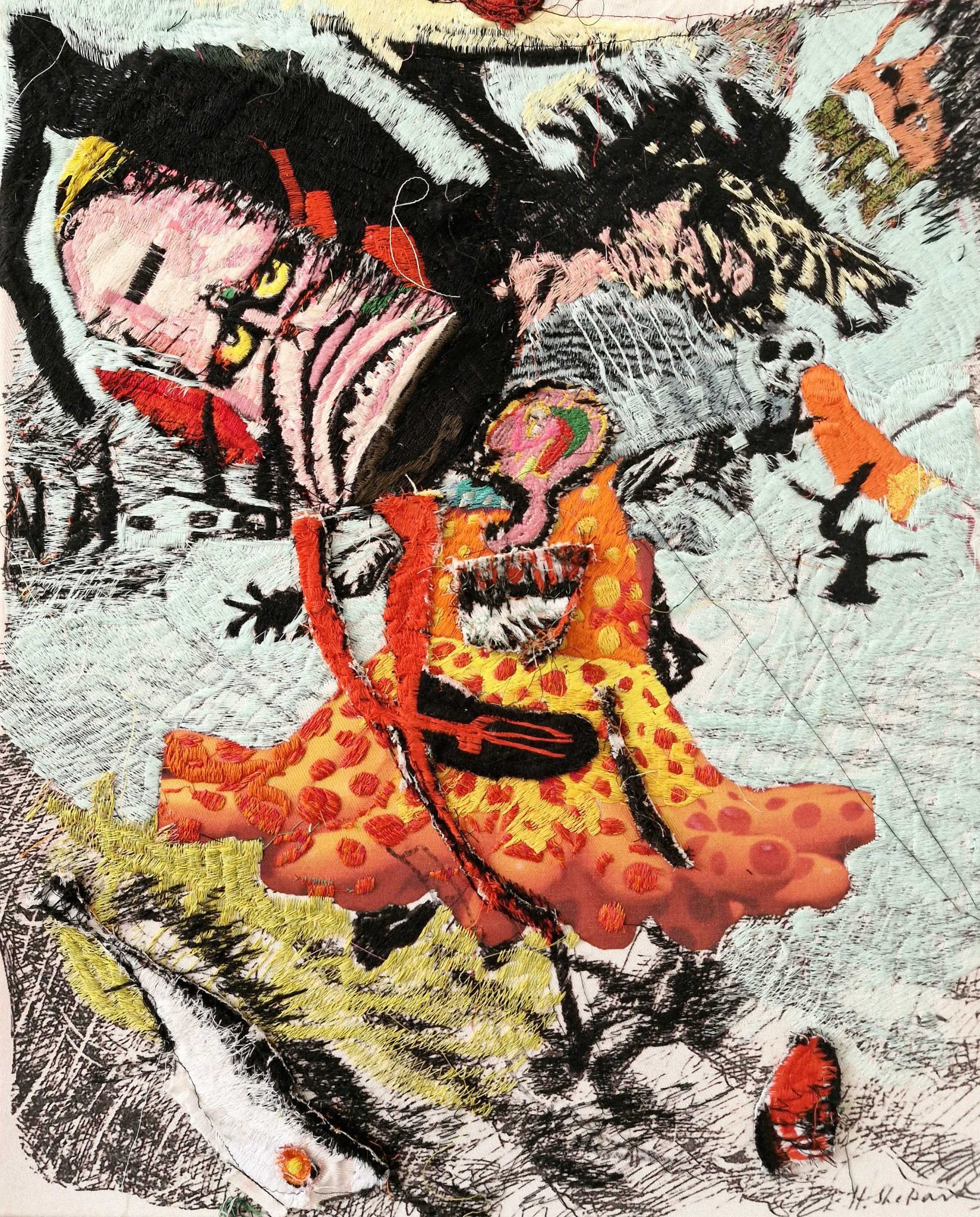 חגית: מאז שפגשתי את העבודות ההן עברו כאמור 20 שנה – ואני חושבת שהתנופה והאפלה של הסיפורים שאתה מצייר נותרה באותה עוצמה. אבל יחד עם הרקמות נוספו צבעים. הפאלטה נהייתה בהירה ומגוונת הרבה יותר, אולי גם בזכות העומק החומרי שהטקסטיל מאפשר, שהוא רך וטקטילי יותר