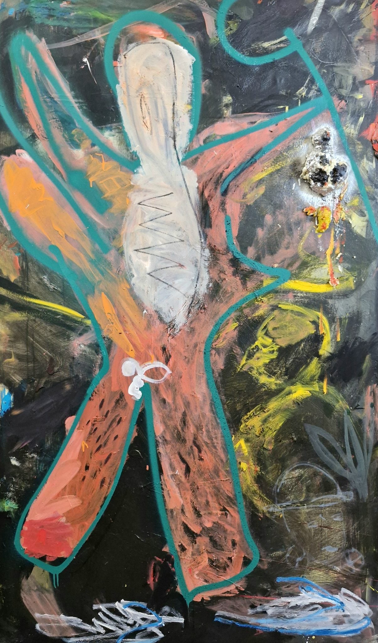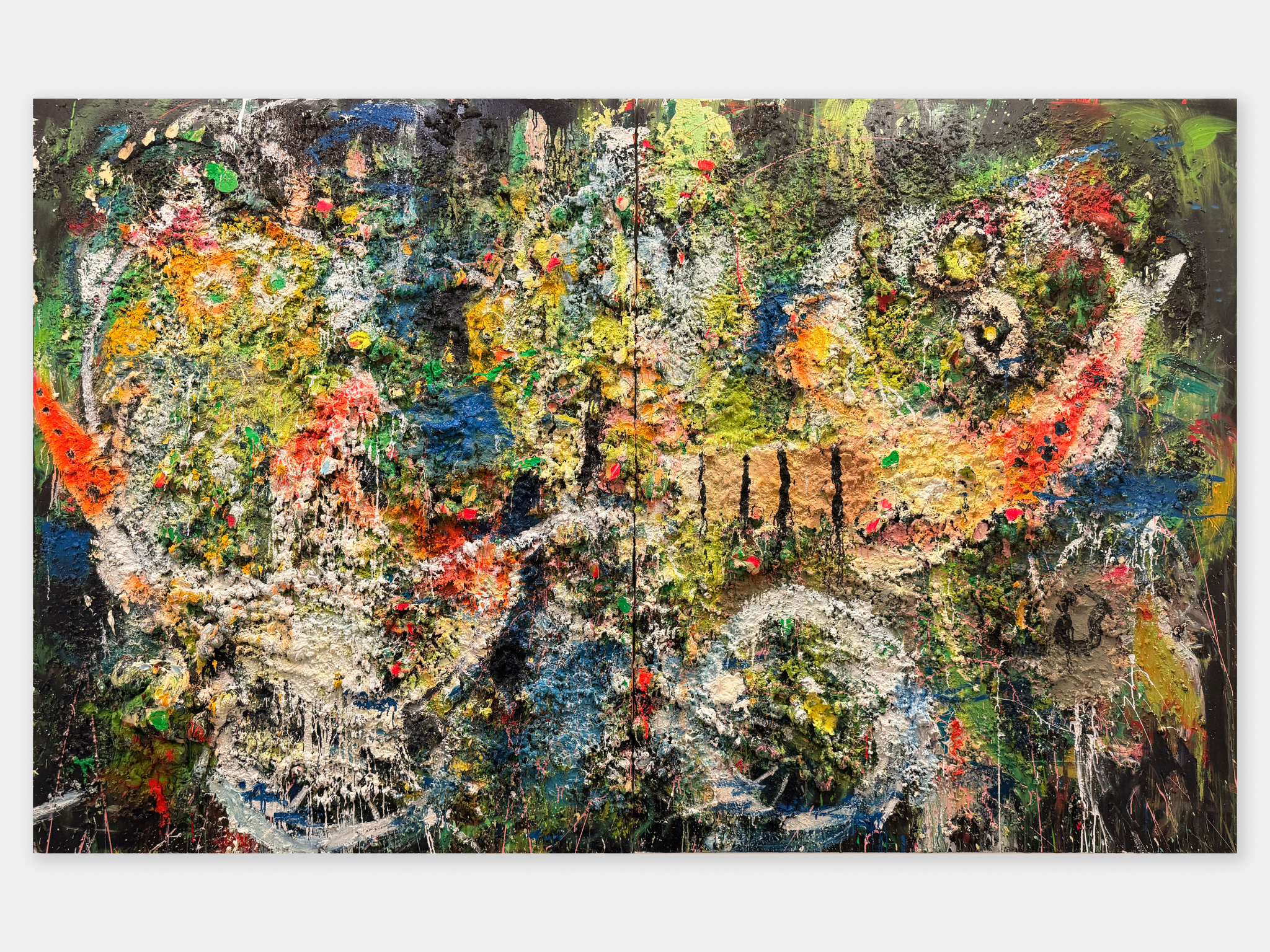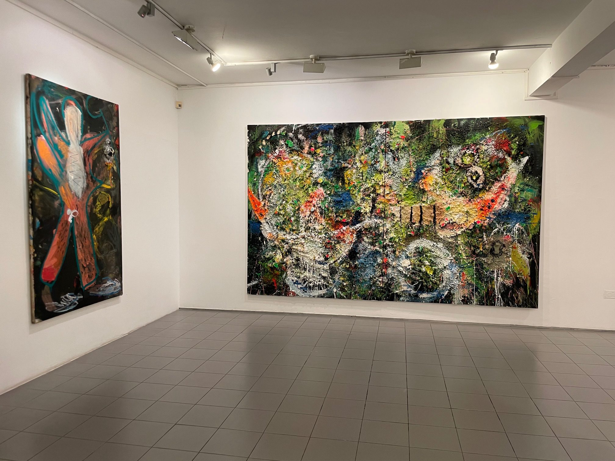 חלק מעבודות השמן שאני מציג בתערוכה כעת הן יותר מוקדמות. כלומר מלפני המלחמה. אבל זה לא אומר שעל מי מנוחות הן נעשו. שתי העבודות הכי גדולות נעשו בתקופת הקורונה ויש עדות חומרית לזה. הן נראות קצת כמו מחלה שהציור לקה בה. הן גם פרצו מיד אחרי התערוכה של השטיחים בהרצליה.