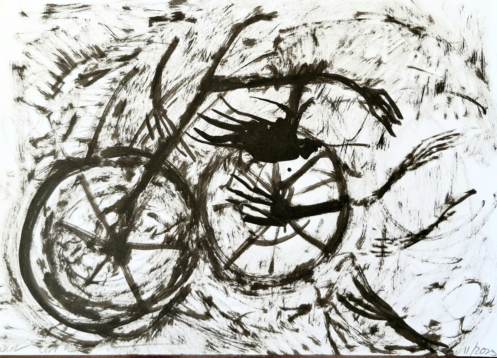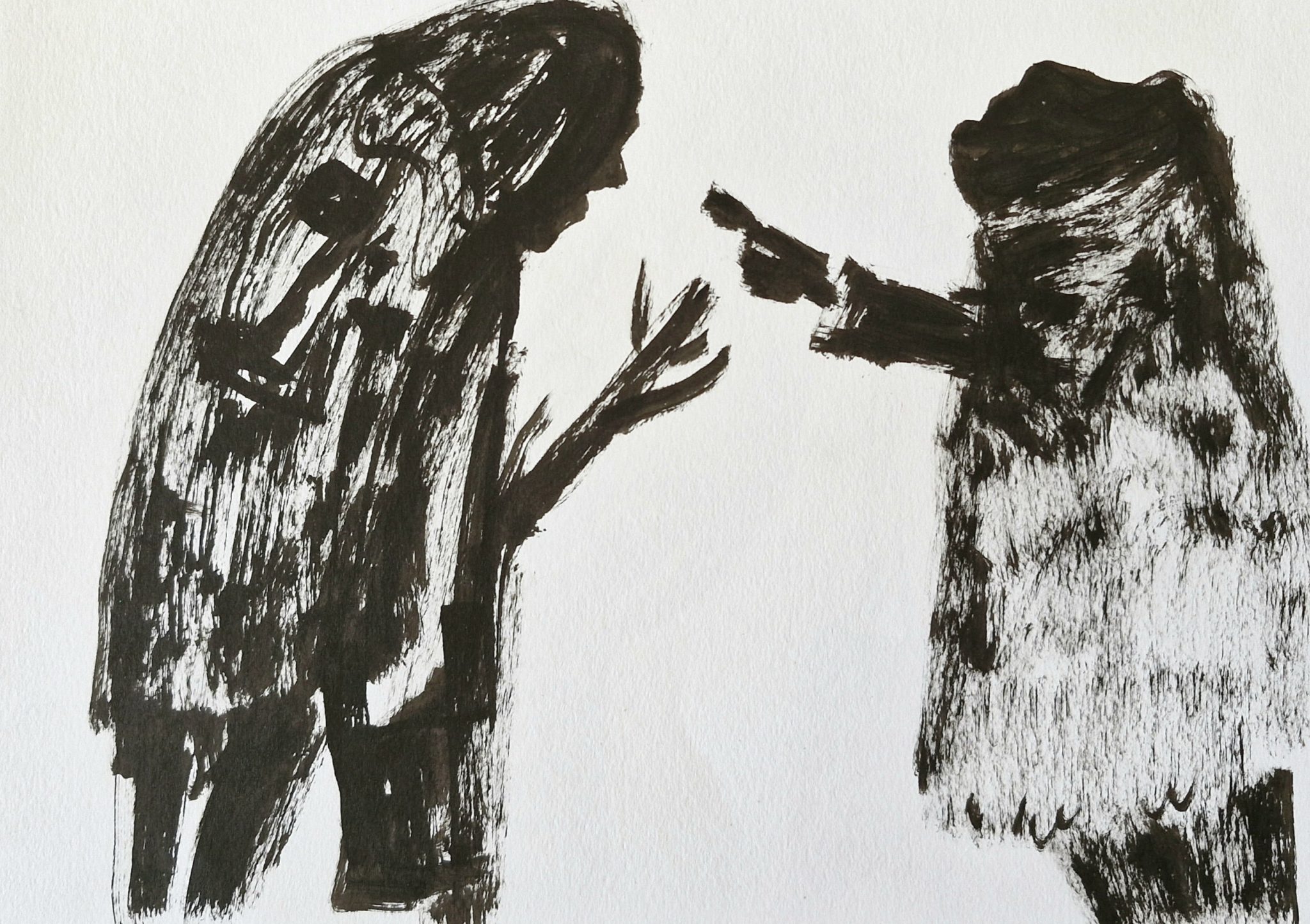 מריק: האוצרת, נעמי בורנשטיין, בחרה 53 עבודות על הנייר, מתוך גוף שכולל מאות עבודות שנשפכו ממני שלושה ארבעה חודשים מתחילת המלחמה ובתוכה. זו לא אילוסטרציה ישירה של כאב התקופה, אלה פחדים, פאניקה שאחזה בי מיד אחרי הפוגרום.