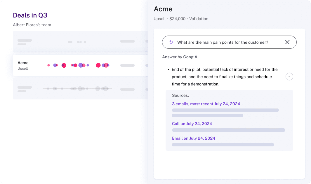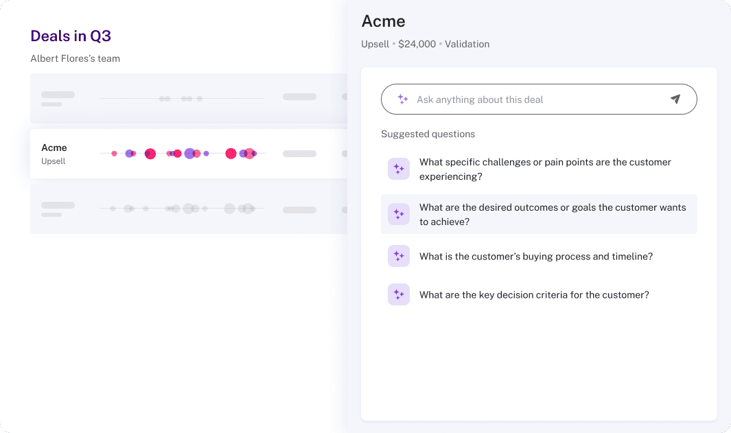 ״בטח. נניח איש מכירות רוצה להבין מה מצב החשבון – כמה פגישות היו, אילו התנגדויות עלו, האם יש סיכוי לסגור את העסקה. הוא יכול לשאול שאלה פתוחה, והמוצר יחזור עם תובנות, כמו העסקה בסיכון כי עלו התנגדויות מסוג א׳, ב׳, ג׳. ואז השאלה היא – אוקיי, מה אני יכול לעשות עם זה? אנחנו לא משאירים את זה שם – אנחנו גם נותנים הצעות לפעולה, כדי לקדם את העסקה הלאה״.