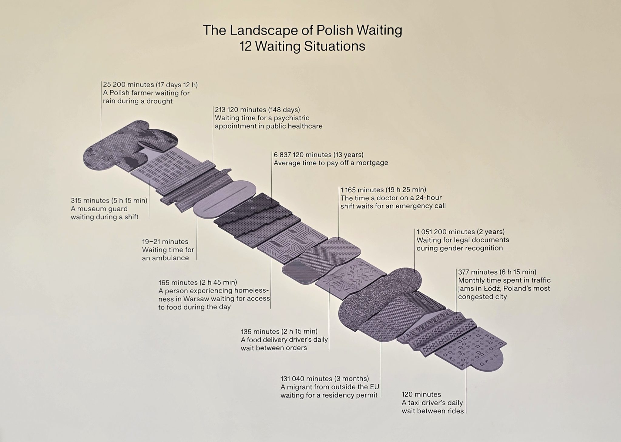 באמצעות אוביקט הבנוי מסדרה של 12 לוחות עץ, שכל אחד מהם מתאפיין במוטיב עיטורי שונה שגולף בעבודת יד, נפרשה בחלל התערוכה קומפוזיציה פיסולית של סימנים המהווים ייצוגים לזמני המתנה שונים. 120 דקות (שעתיים) של זמן המתנה יומי מצטבר של נהג טקסי בין נסיעות; 377 דקות (6 שעות ו־15 דקות) של עמידה חודשית בפקקי תנועה; 25,200 דקות (17 ימים ו־12 שעות) ציפייה של חקלאי פולני לגשם; 131,040 דקות (שלושה חודשים) המתנה של מהגר לאישור שהייה; 213,120 דקות (148 ימים) המתנה לפגישה עם פסיכיאטר במערכת הבריאות הציבורית בפולין ועוד. הקידוד החזותי של נקודות השהייה בדינמיקת החיים מעלה סוגיות חברתיות ומציף פערים של דפוסי חיים בין אוכלוסיות שונות.