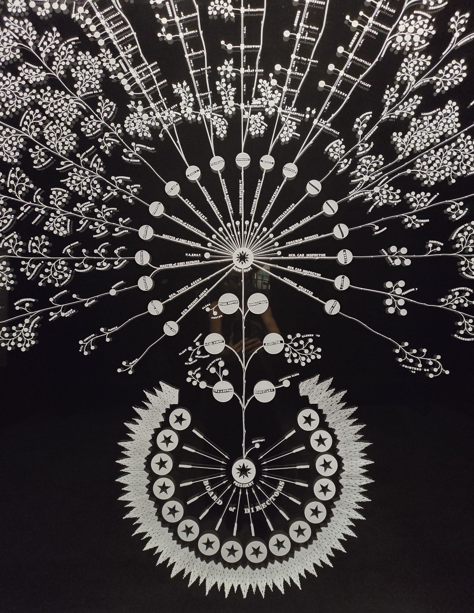 התחושה הראשונה שלי למול ההצבה היתה לנשום עמוק, להתיישב, ולהתבונן ארוכות בדימוי שובה הלב. כשקמתי כדי לקרוא אודות האוביקט גיליתי שהרישום האסתטי הוא הגדלת ענק של מה שנחשב התרשים הארגוני הראשון – תרשים משנת 1855 שעיצבו אנשי תעשיית הרכבות כדי להמחיש את המבנה ואת היררכיות האחריות של החברה באופן קומוניקטיבי. כלי תקשורת בניהול של ארגון גדול ושל אנשים המפוזרים במקומות רבים, באוביקט ויזואלי המסביר לכל אחד את תפקידו בתוך המכלול. אינפוגרפיקה 101.