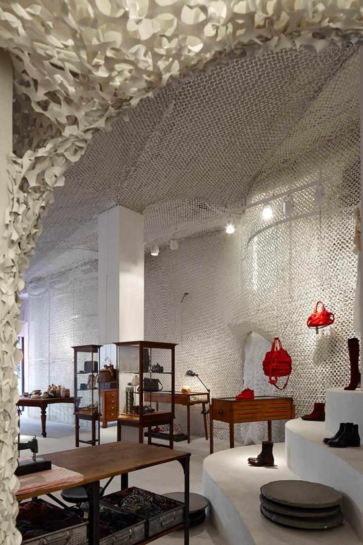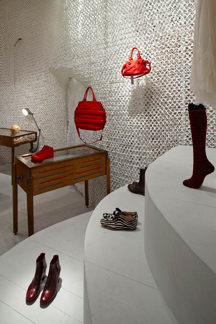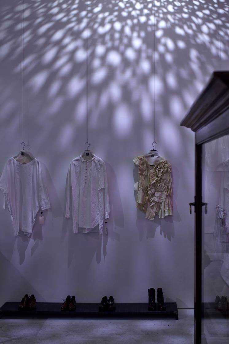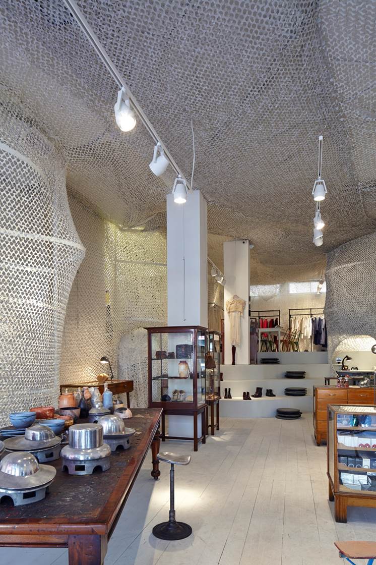 ״רהיטי תצוגה מתקופות שונות, אוסף בעלי החנות, הוצבו במפלסים השונים של החלל, ומציגים כבתערוכה מוזיאלית קולקציות בגדים, אביזרים ואובייקטים עיצוביים״.