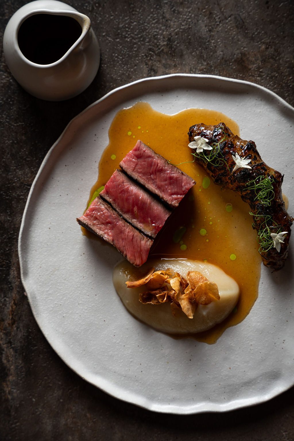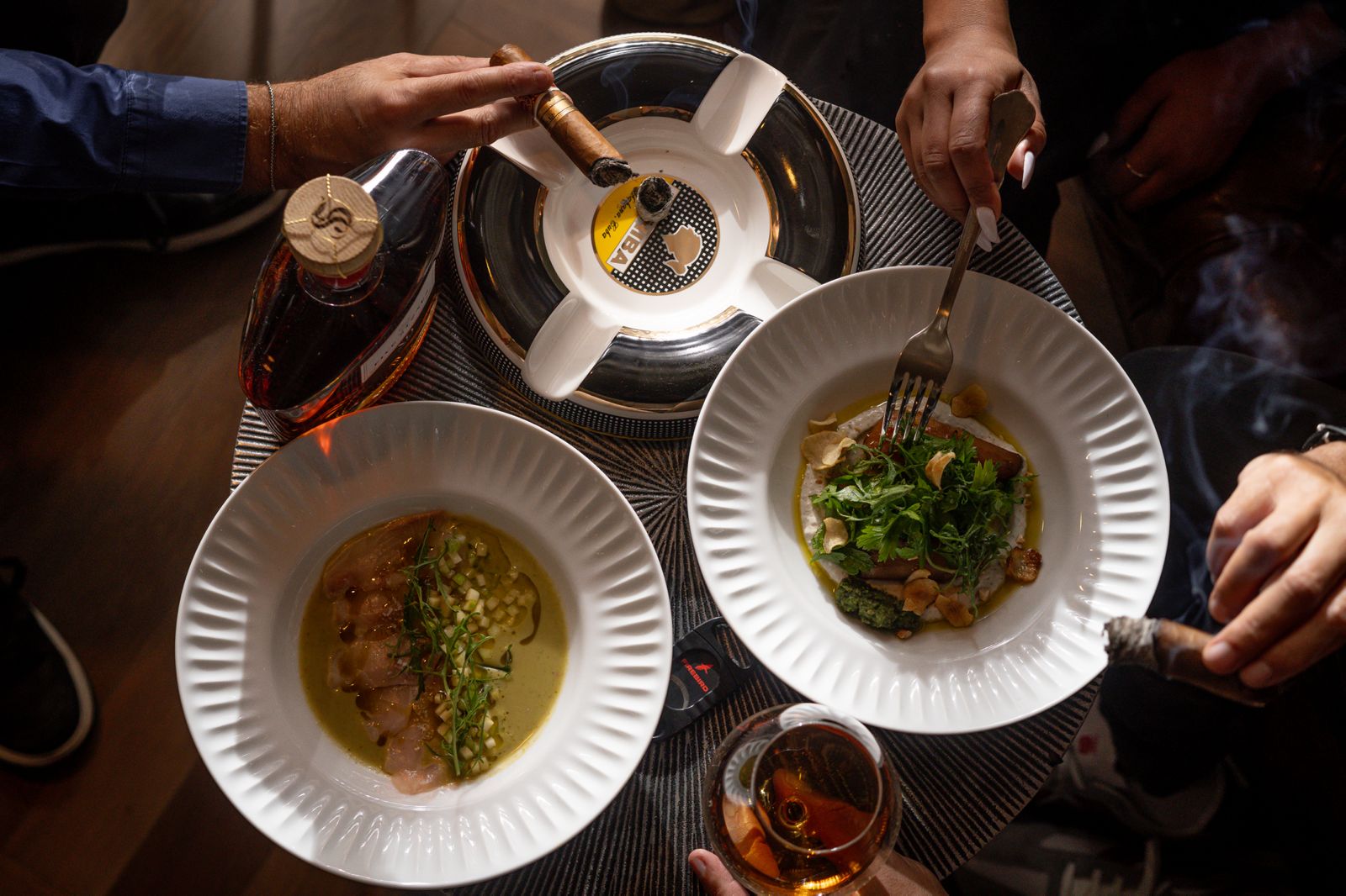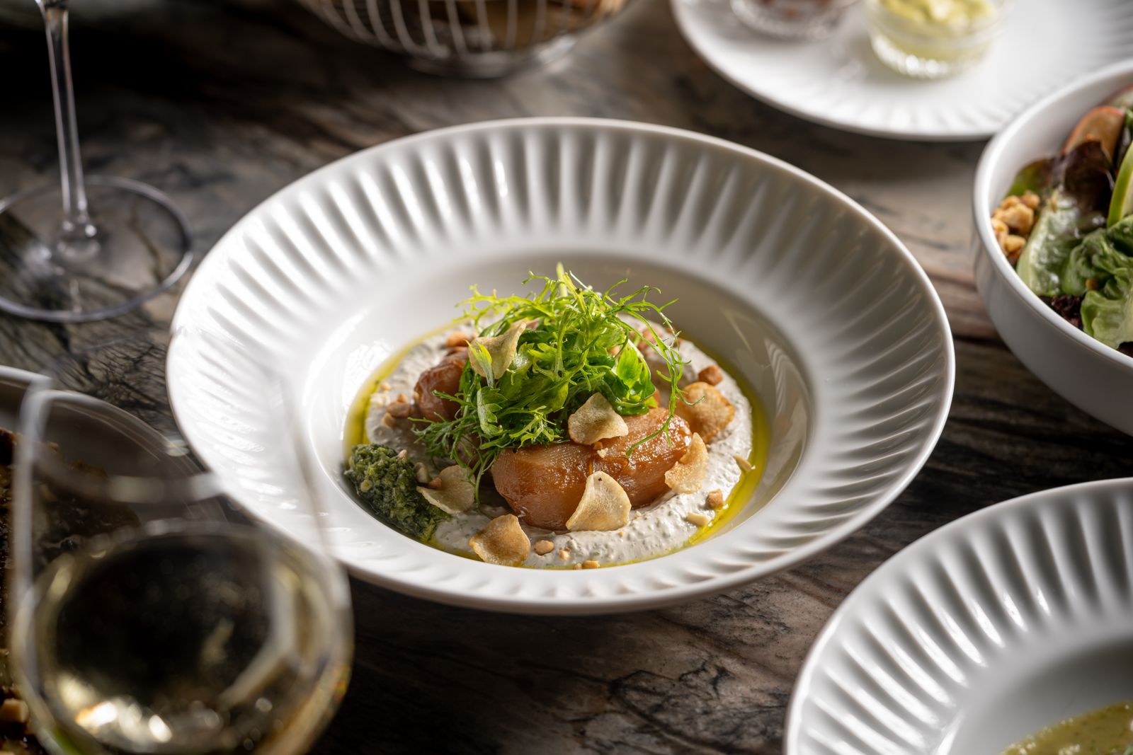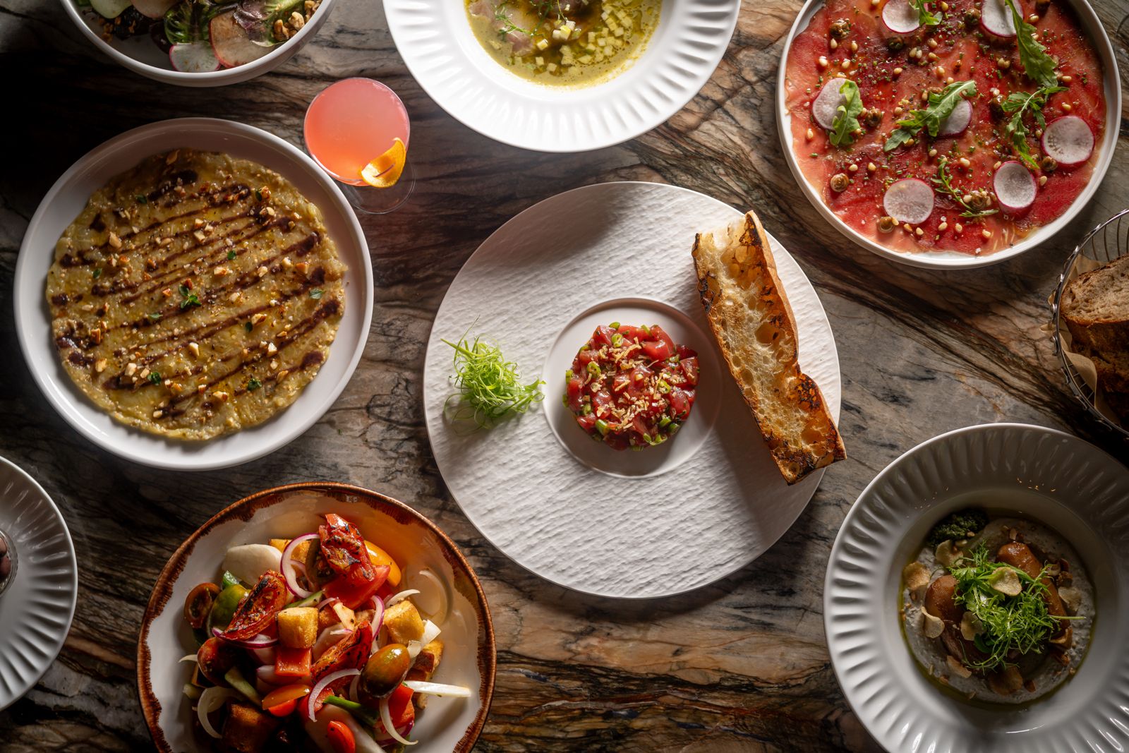 בראשונות אפשר לבחור בין אויסטרים מברטן עם צ ׳ילי מותסס; סביצ ׳ה דג ים, עלי וואסאבי, חלפיניו וכוסברה; טרטר דג ים עם איולי חמאה חומה על בריוש; או טרטר בקר עם איולי קיסר, שאלוט ובריוש. למנות ביניים מקבלים שיפוד פטריות מלך היער בציר פורצ׳יני וקרם קשיו ומנה של תירס גמדי על פחם, רליש שיפקה, בצל ירוק ופרמזן.