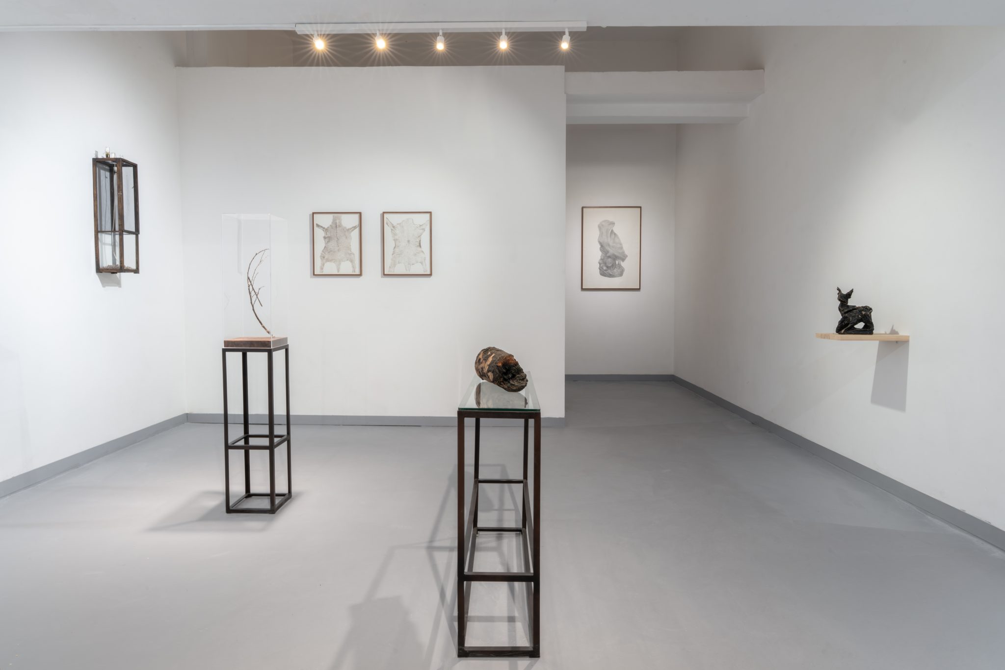בתערוכה אציג כמה עבודות מסדרת השרופים – שעוסקת בדברים שנשרפו – בעיקר רקמות צמחיות שנשרפו; וכן עבודות מסדרת הפורצלנים – פסלי פורצלן וינטג׳ של חיות שרכשתי, ציפיתי וכיסיתי בעורות. אציג גם רישומי נוף ורישומי עורות פרוסים.