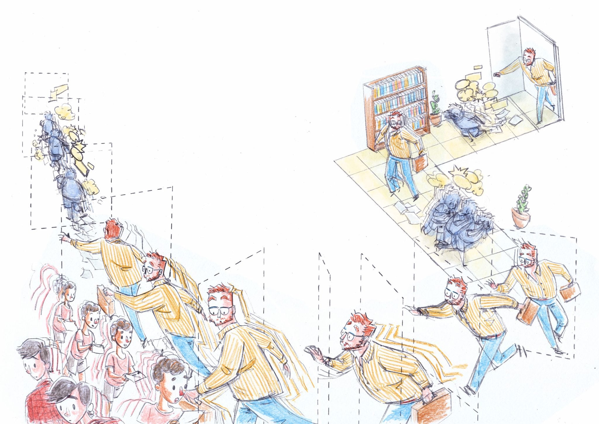 כדי לבטא את המתח הזה באופן ויזואלי, יש בספר שני עולמות דימויים. האחד הוא העולם של שיעורי הקומיקס, שהוא חם, לפרקים כאוטי, ומתבטא בצבעים פסטליים, בחומריות של חומרי יצירה כיתתיים, בהרבה חללים נגטיביים ובשימוש חלקי בסקיצות המקוריות.