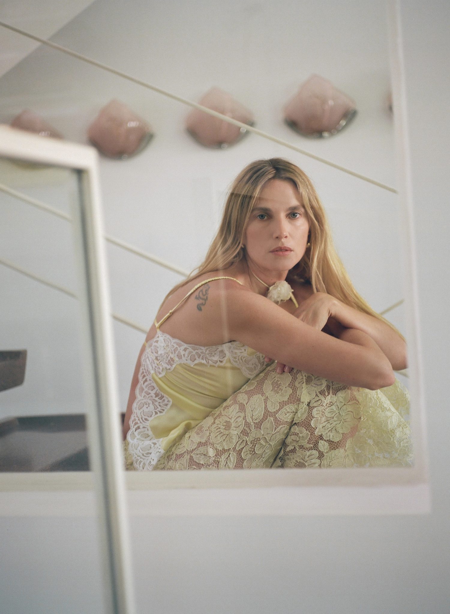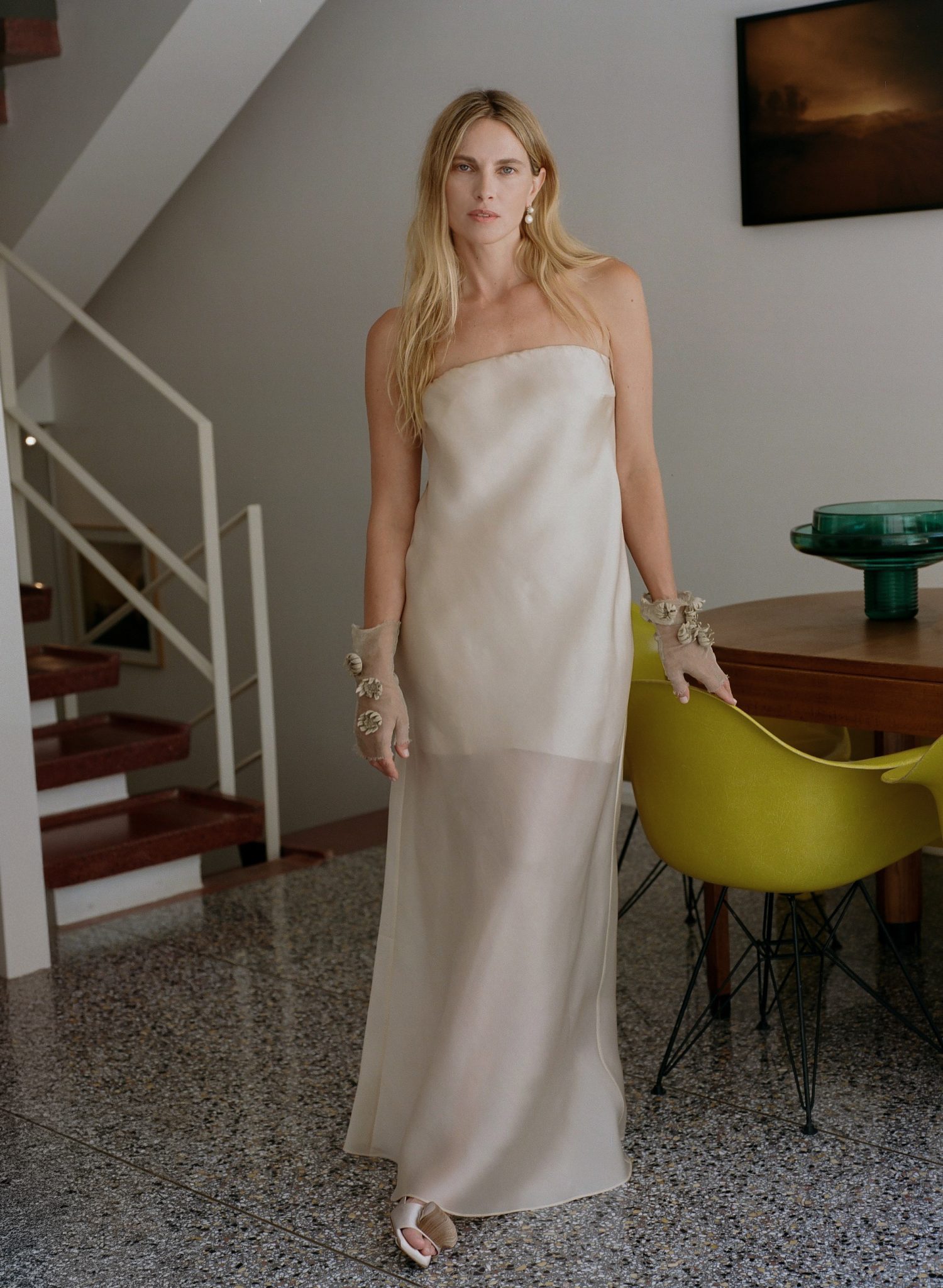 שמלת Jane – שמלה המלווה אותי מספר שנים ובכל עונה מקבלת צבעוניות חדשה. העונה בחרתי לייצר אותה בגוונים צהובים. זו שמלת משי קלאסית המשלבת עבודת תחרה שקופה ושסע, בתוספת כיווצים קטנים וכפתורי משי. היא משלבת גזרת אלכסון קלאסית ונוצרה בעבודת יד מוקפדת ומתוך חשיבה על קווי הגוף.