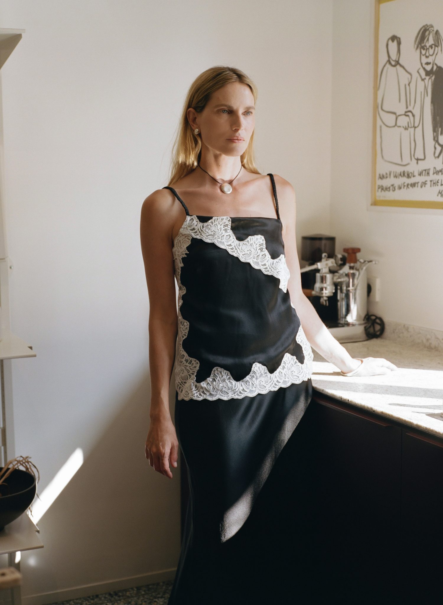 שמלת לורן וצעיף תחרה – שמלת מקסי ארוכה שנתפרה מבד משי מכובס רך ונשפך, בשילוב תחרה עדינה שמוסיפה לה מגע רומנטי. הגזרה בנויה בקווים מחושבים שמותאמים לגוף ומדגישים את הצללית הנשית, תוך שמירה על תחושת נינוחות ותנועה חופשית.