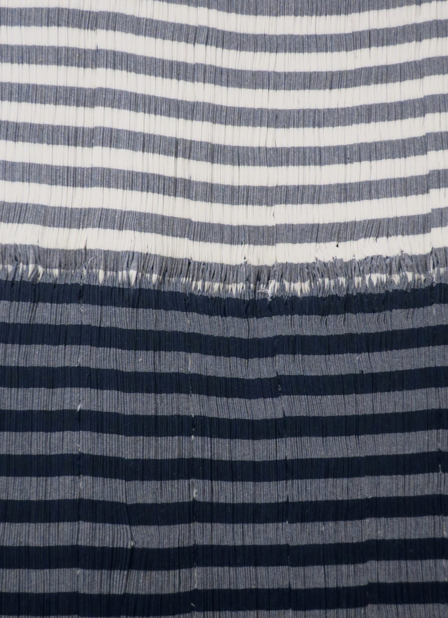עוד נקודת התייחסות מעניינת, שהייתה סוג של גילוי מבחינתי, הייתה הצד השני (או האחורי) של העבודה. העיסוק בצד הזה הוא משמעותי בטקסטיל תמיד. בגלל התנועה הגלית של הקפל, כשהפס של הצבע מתעגל לכיוון אחד – הפס הלבן מתעגל לכיוון הנגדי, כך שבצד השני של העבודה נוצר היפוך של היחסים בין הצבע ללבן. זה מצביע בעיניי על החוכמה של החומר. ז׳יל דלז, הפילוסוף הצרפתי, הרבה לדבר על התפיסה של הקפל בהקשר לזמן, וטען שלקפל אין צד קדמי ואחורי, אלא שזה תלוי בנקודת המבט