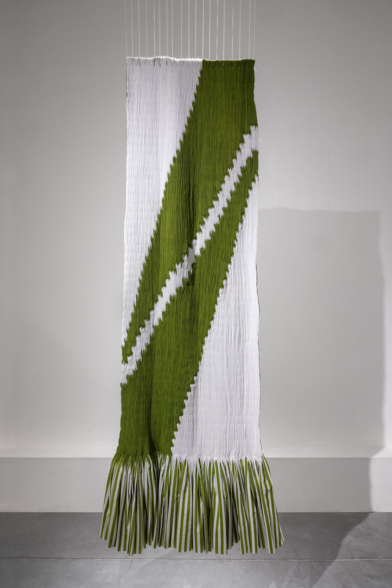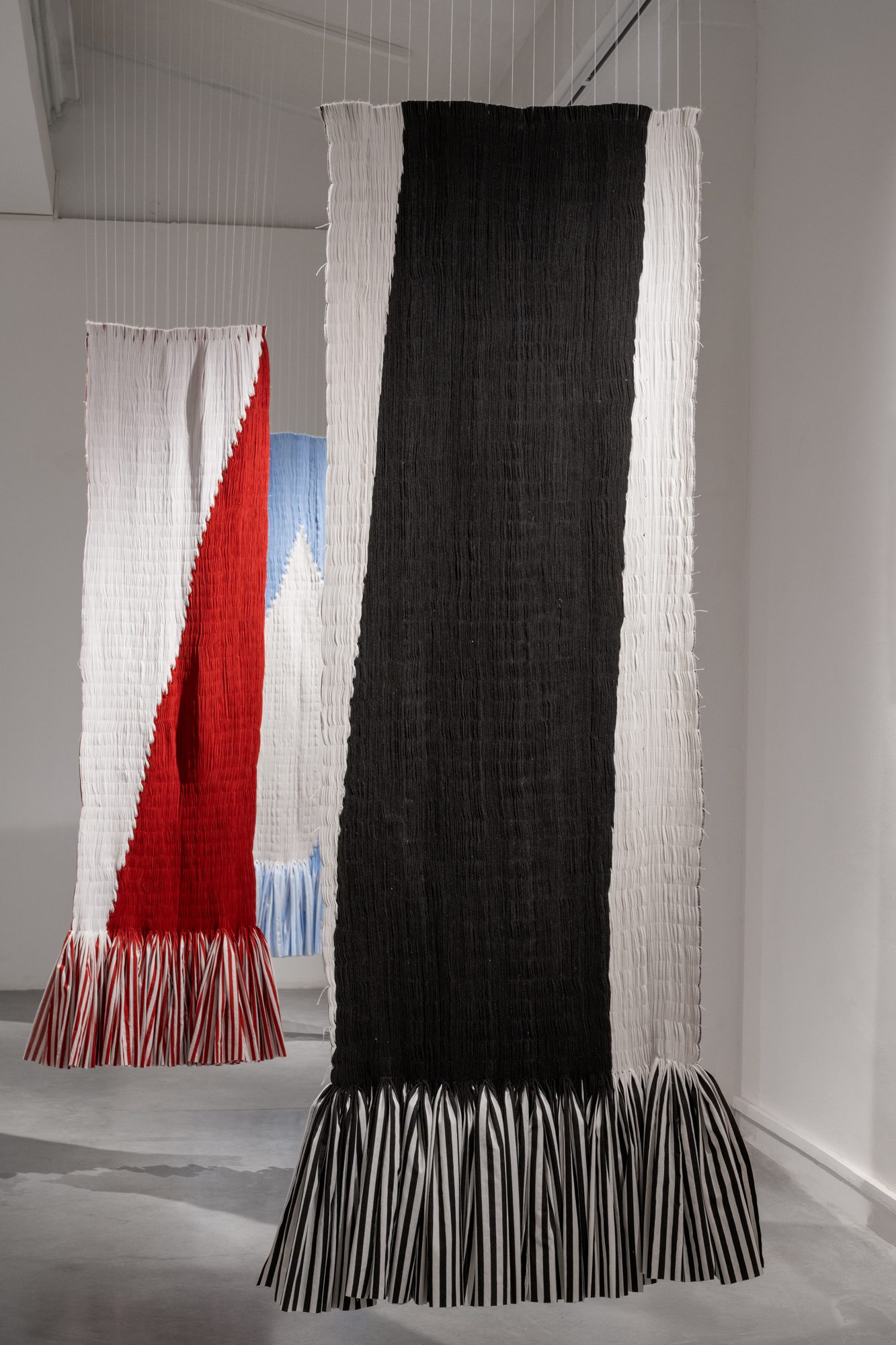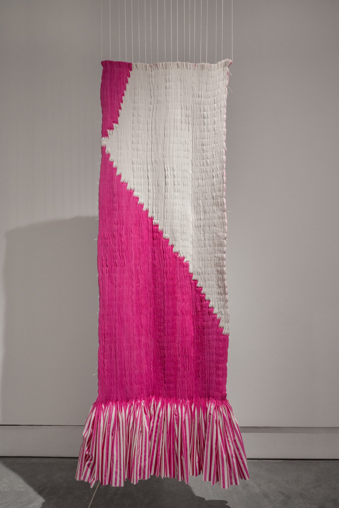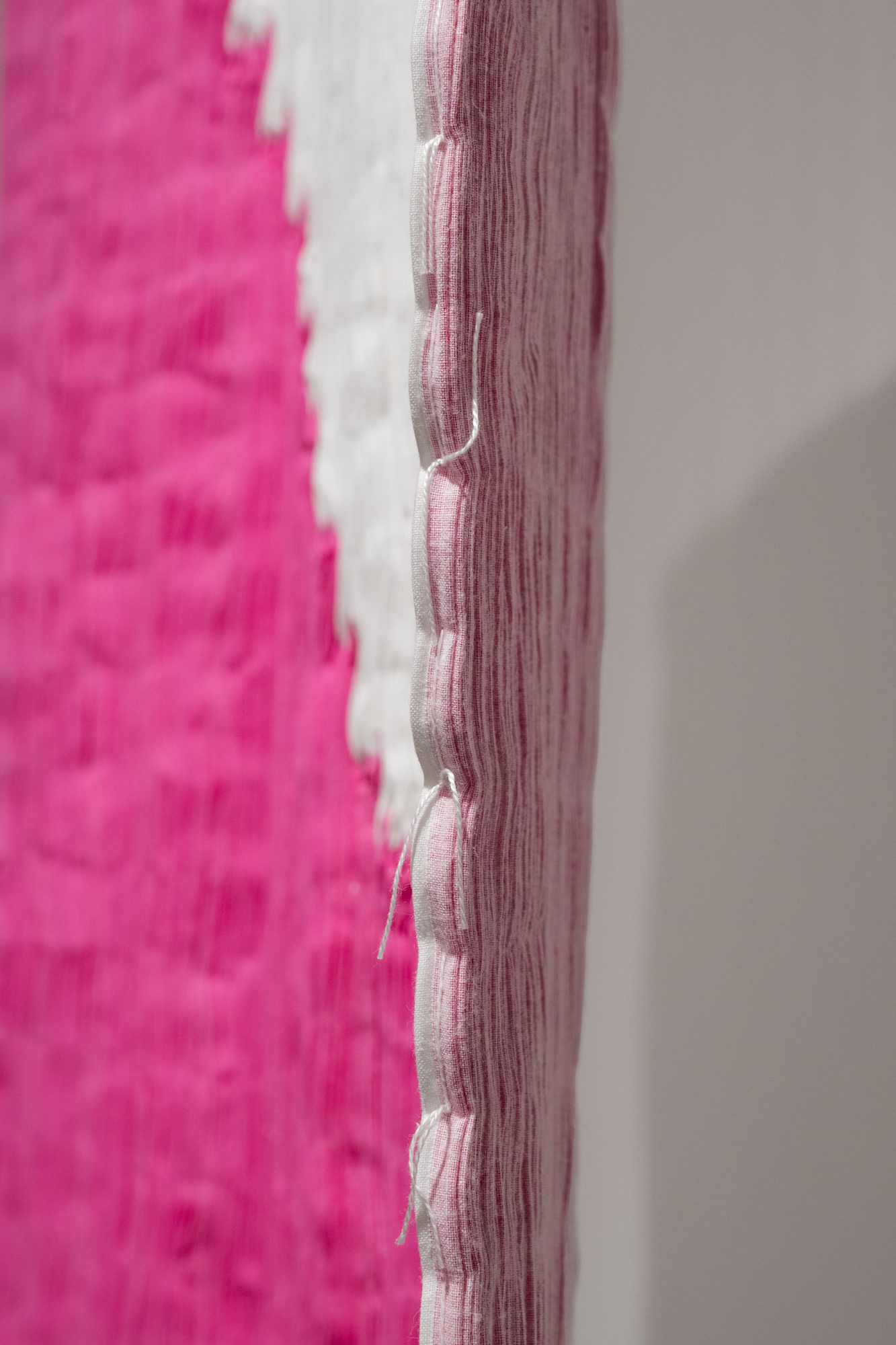 זה דומה בחשיבה לפעולת אריגה של שתי וערב. כשחוט התפירה שלי ממוקם מעל פס הצבע – הפס הלבן ייראה לעין; ולהיפך – כשחוט התפירה מתחתיו — פס הצבע הוא זה שייראה. אני מחליפה את החוטים בפסים. הפעולה החזרתית הזו של תפירת וכיווץ הבד מאפשרת נקודת מבט שונה על בד הפסים המוכר, והופכת אותו לאובייקט פיסולי בעל נוכחות חומרית גשמית חזקה