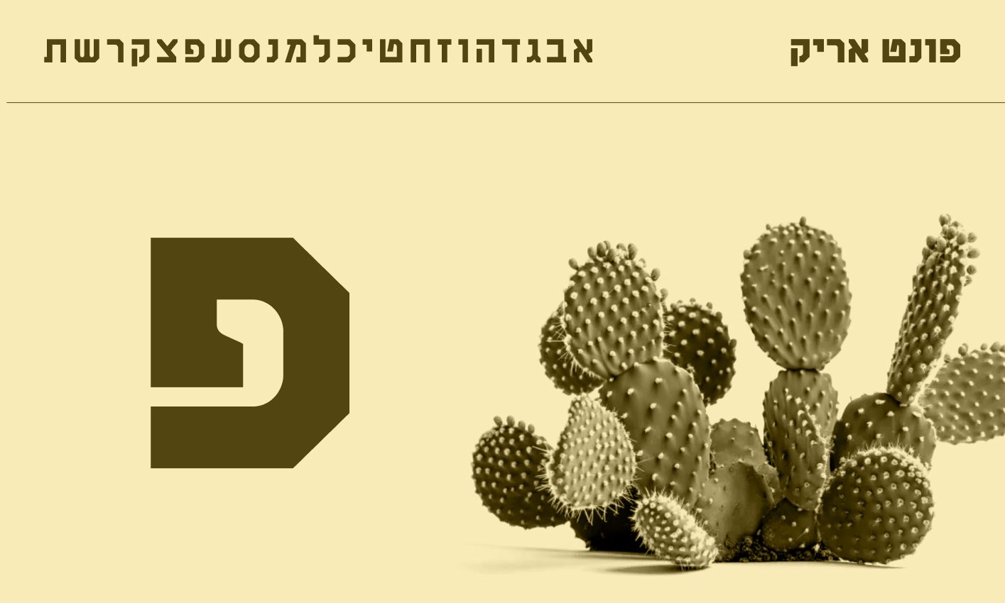 הפונט הראשון שעיצבתי, מיד עם תחילת המלחמה, היה ״אריק״ – מעין הנצחה של זהות מקומית כפי שאני רואה אותה: תכליתי כלפי חוץ אך רך מבפנים. דוגמה מובהקת לכך היא באות ״פ״, שמבחוץ בנויה מזוויות ישרות קטומות ומבפנים עם רדיוסים. התוצר שמתקבל הוא מין היבריד מוזר שאהבתי – משהו מעט משובש, חוויה כמעט ידנית. כמעצב תמיד נמשכתי לעברית בצורתה הפשוטה והגיאומטרית עם מעט טוויסט, ו״אריק״ ביטא זאת היטב.