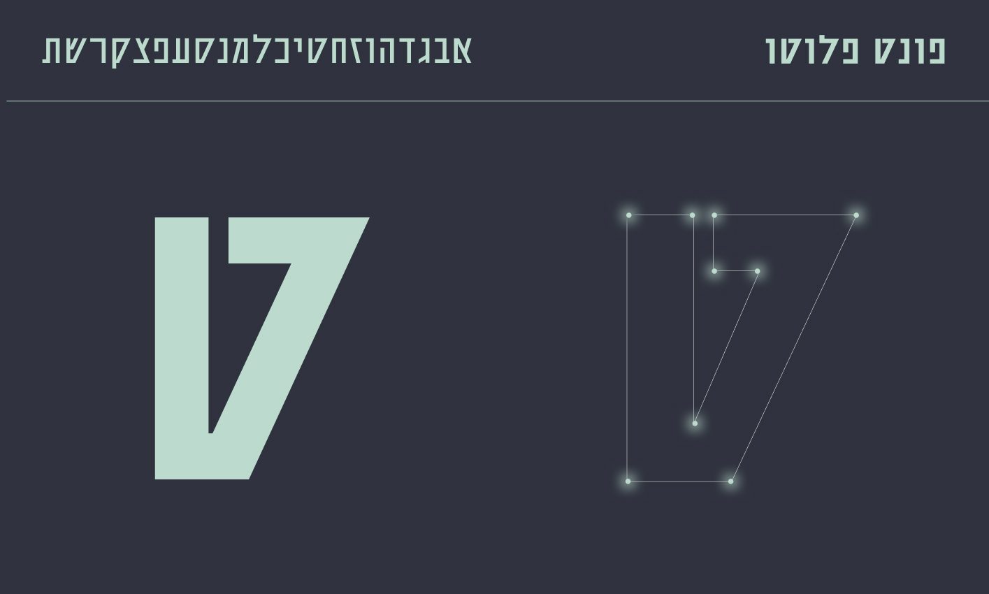 בשני הפונטים ניסיתי לפשט את הסגנון ולהצמיד את האות לקו יחיד, כשההבדל בין האותיות נוצר מתנועת הזווית של המישורים השונים, כפי שאפשר לראות באותיות ט׳ ו־ת׳ בפונט ״פלוטו״. הרעיון היה לחזור למשהו ראשוני, כמעט כמו בריאה מחודשת של האות העברית, כמטאפורה לחברה הישראלית הזקוקה לאתחול מחדש.