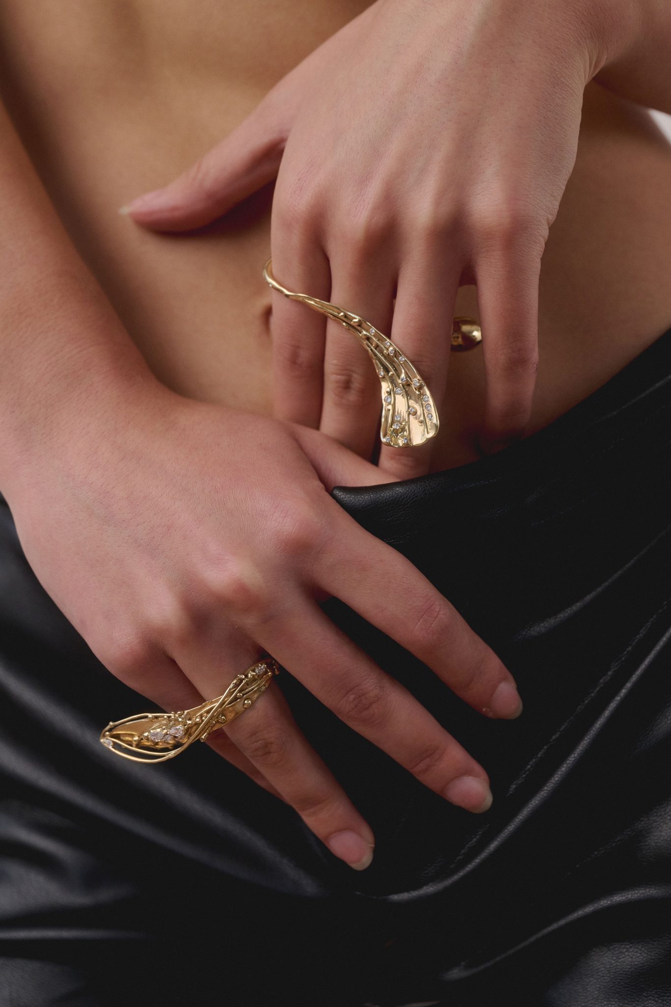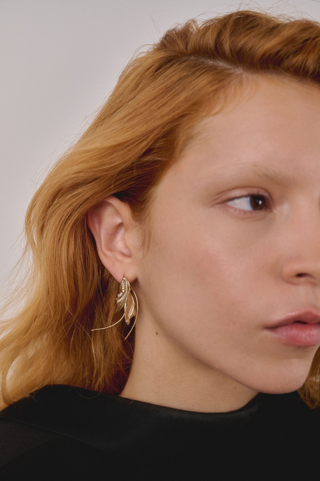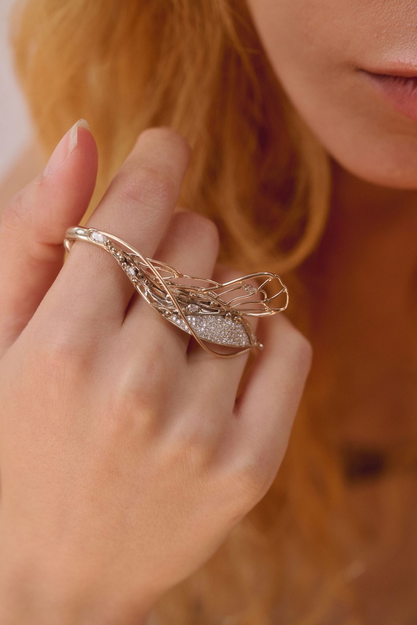 בגלל מחיר הזהב, לא יכולתי ליצור תכשיטים כמו בקולקציות קודמות. נדרשתי ללמוד לזקק ולאפיין מחדש את האמנות שלי. בעבר עסקתי בחיות באופן כללי יותר. הפעם התעמקתי בחרקים בעלי כנפיים ובפרחים, ובמפגש הפיזי שלהם עם טיפות הטל שיורדות עליהם במהלך הלילה. בחנתי מקרוב את הלוק הקסום שנוצר כשכנף כמעט שקופה ועל פניו חלשה, עמוסה כולה בטיפות שמאיימות לשבור אותה. אבל במקום שבר נוצר בה מראה נוצץ ויוצא דופן של שני אלמנטים שנראים עדינים – אבל מחזיקים ומכילים כל כך הרבה חיים.