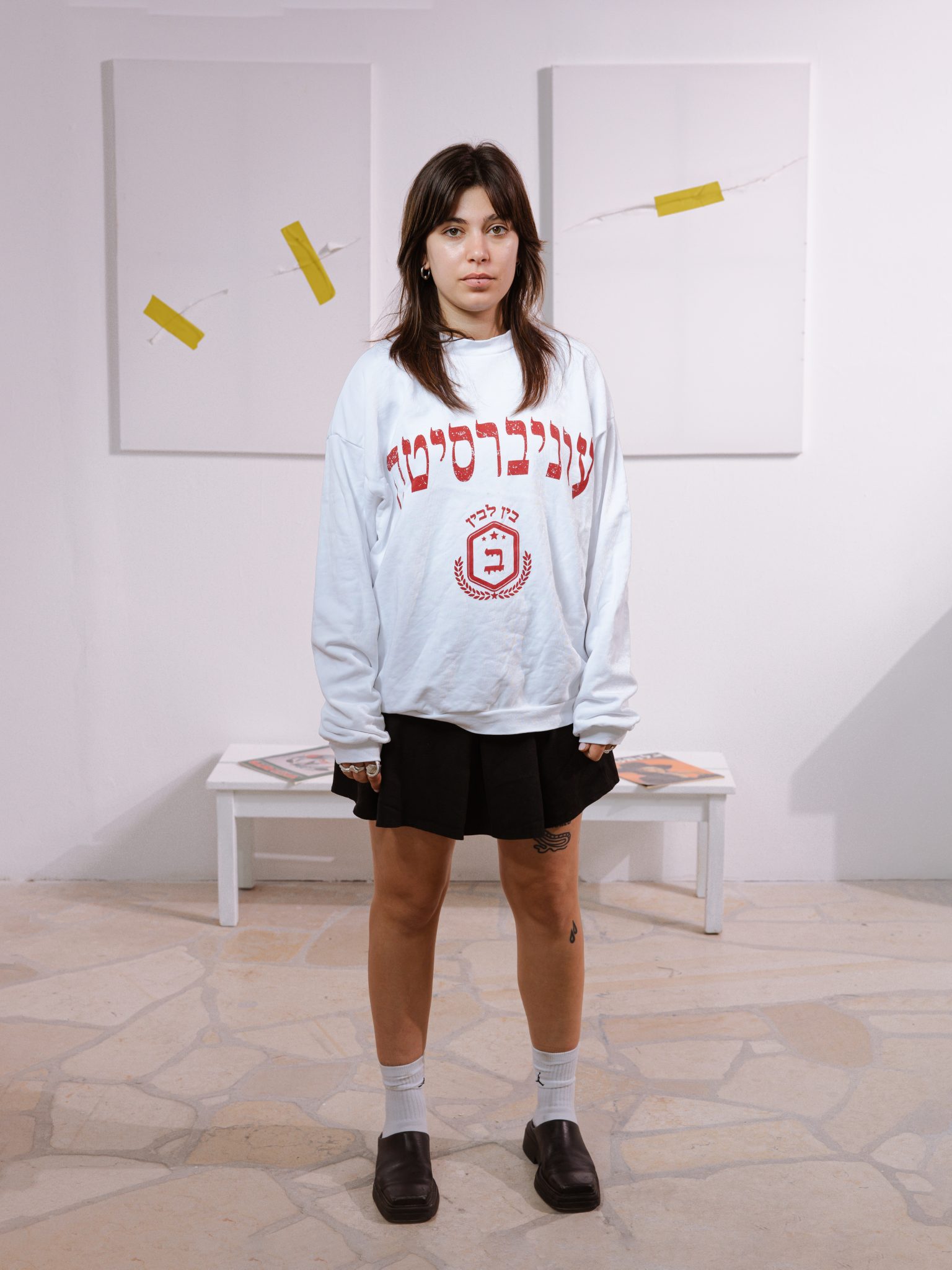 יצרתי, לדוגמה, סוויטשירט עם כיתוב ״עוניברסיטה״. ההשראה הראשונית היתה בגדי קולג׳ ותמונה של הנסיכה דיאנה, והתגלגל למשחק עם השפה העברית והחלפת האות, ואז הפך להיות גם משהו שהוא ממקום של תנועת נגד – מה שמדבר אליי. גם דיאנה היא דוגמה לתנועת נגד, וכשדברים מתחברים וסוגרים לי מעגל – אני מפסיק לחפש ועושה את זה.