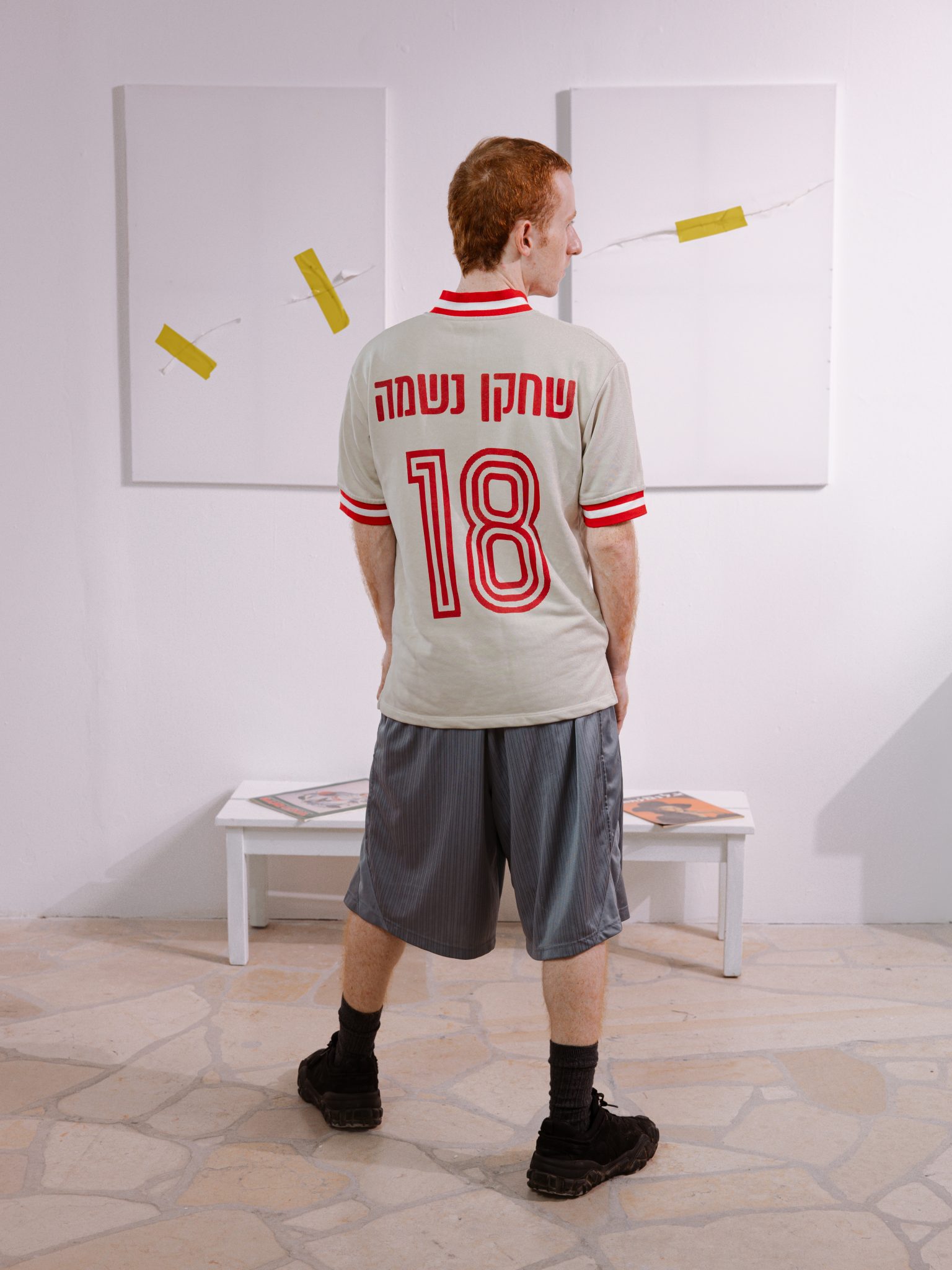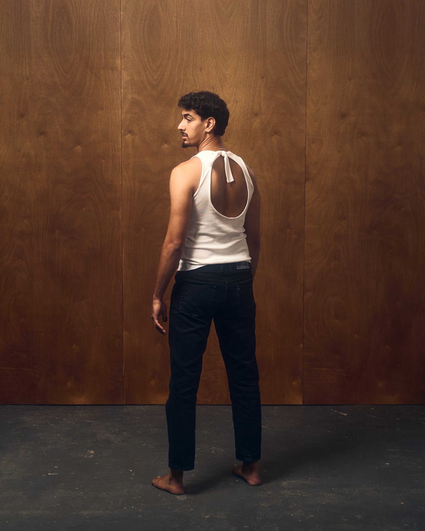 הפרויקט האחרון שלי נקרא ״אסלים קלאסים״. בחרתי להסתכל על הלבוש הישראלי הכי יומיומי כמו חליפות טרנינג, גופיות סבא, סווטשירטים של אדידס – ולתת לו פרשנות חדשה. רציתי לקחת את מה שנחשב עממי ולהרים אותו, לערבב בין רחוב לאצולה. לקחתי לדוגמה גופיית סבא – פריט שהוא סמל לגבריות ישראלית – ושילבתי בה אלמנטים נשיים כמו מחשוף גב עם קשירה.