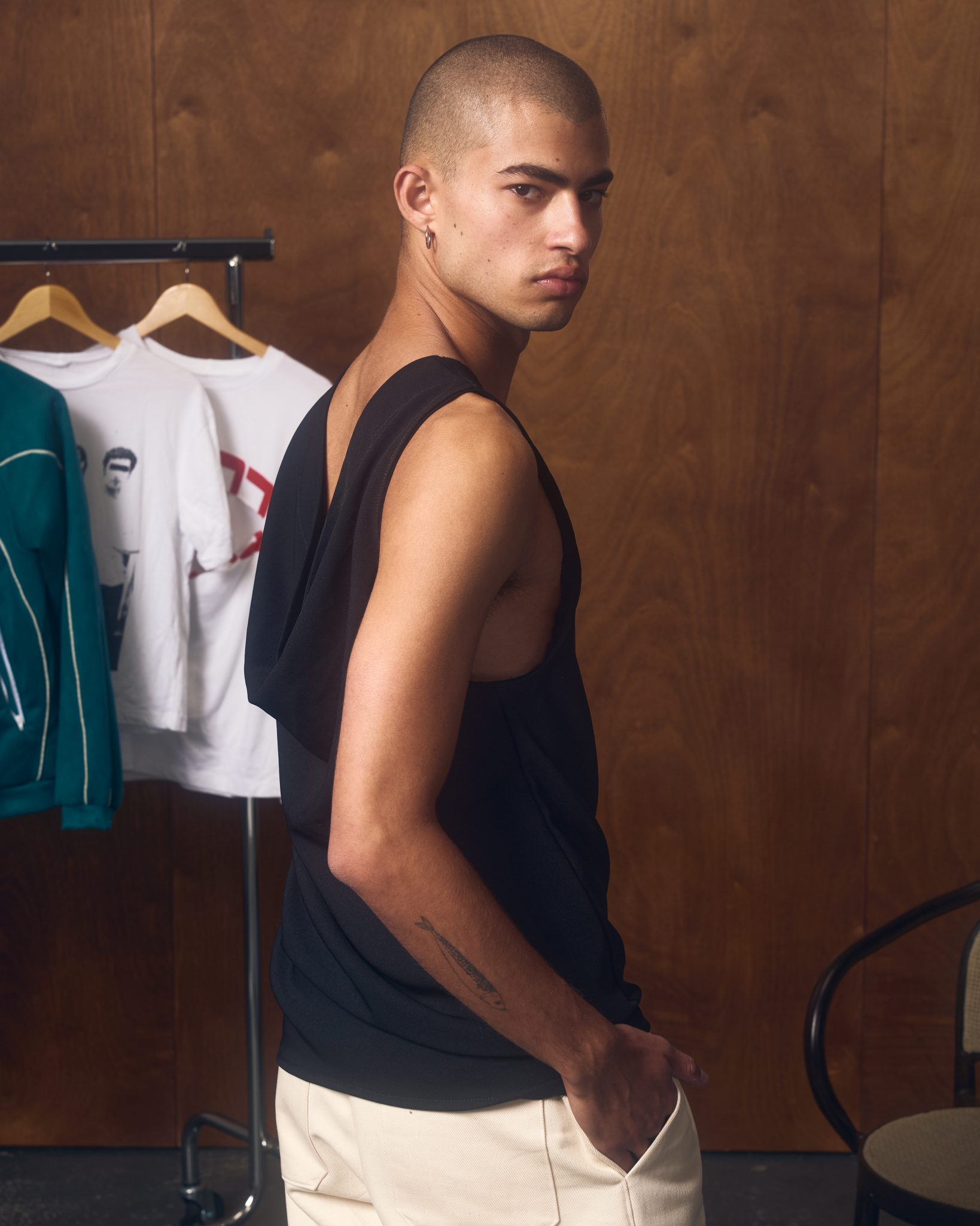 בקולקציה הזו ביקשתי להתבונן על חלק מסוים בתרבות שלנו. עשיתי את זה באמצעות אלמנטים שונים של גבריות ישראלית, של עדינות וחספוס, ושל מעמד, ראוותנות ויוקרה שקטה. ביקשתי לבדוק מה קורה כשמאחדים ביניהם, כשנותנים להם להיפגש באותו עולם. התוצאה היא תערובת של בין לבין.