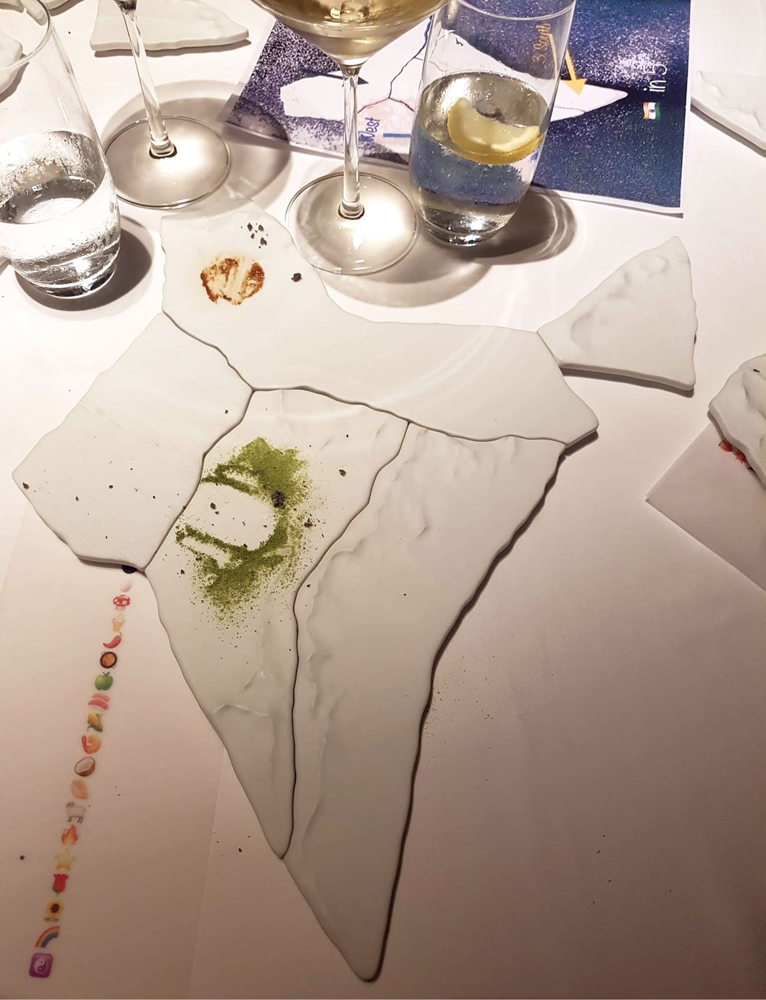 אה כן, חמש הצלחות של המנות הראשונות לא פונו מהשולחן משום מה. כשנשאלנו לפני המנה השישית אם הבנו למה, אז הגיע ההסבר, תוך כדי שהתבקשנו (והצלחנו) לשחק איתן ולראות שהן מתחברות כולן לפאזל (!!!) בצורת תת־היבשת ההודית, וכל מנה שהוגשה הגיעה מאזור אחר ביבשת. לסת על רצפה. מדהים.