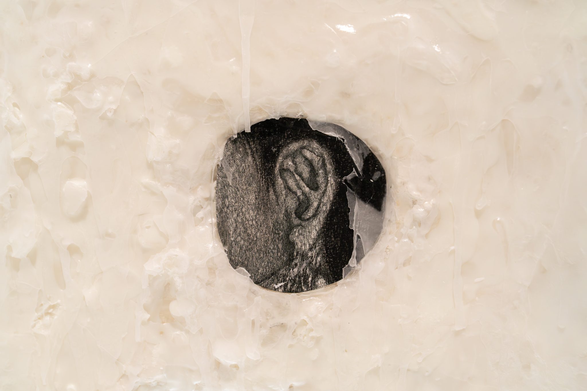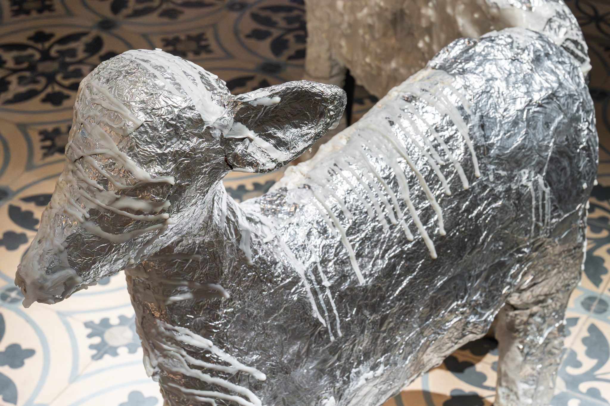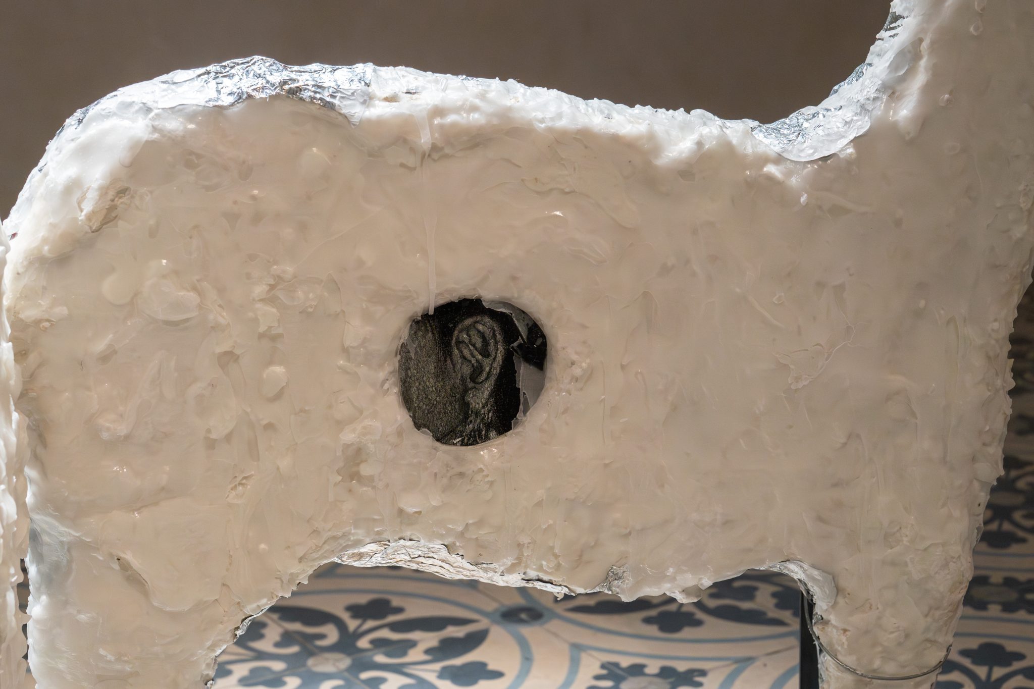 העבודה השנייה היא פסל שמורכב משני חלקים שנפתחים הצידה. מבפנים האיילים מכילים שעווה נמסה, ובאחד מהם שזור ציור גרפיט של אוזן שמקשיבה. חיצוניות האיילים עטופה בנייר כסף – צבע כסוף שהיה בביתנו ובחברה סמל לגרש שדים, ובמקרה הזה מעניק גם תחושת הגנה ורפלקטיביות.
