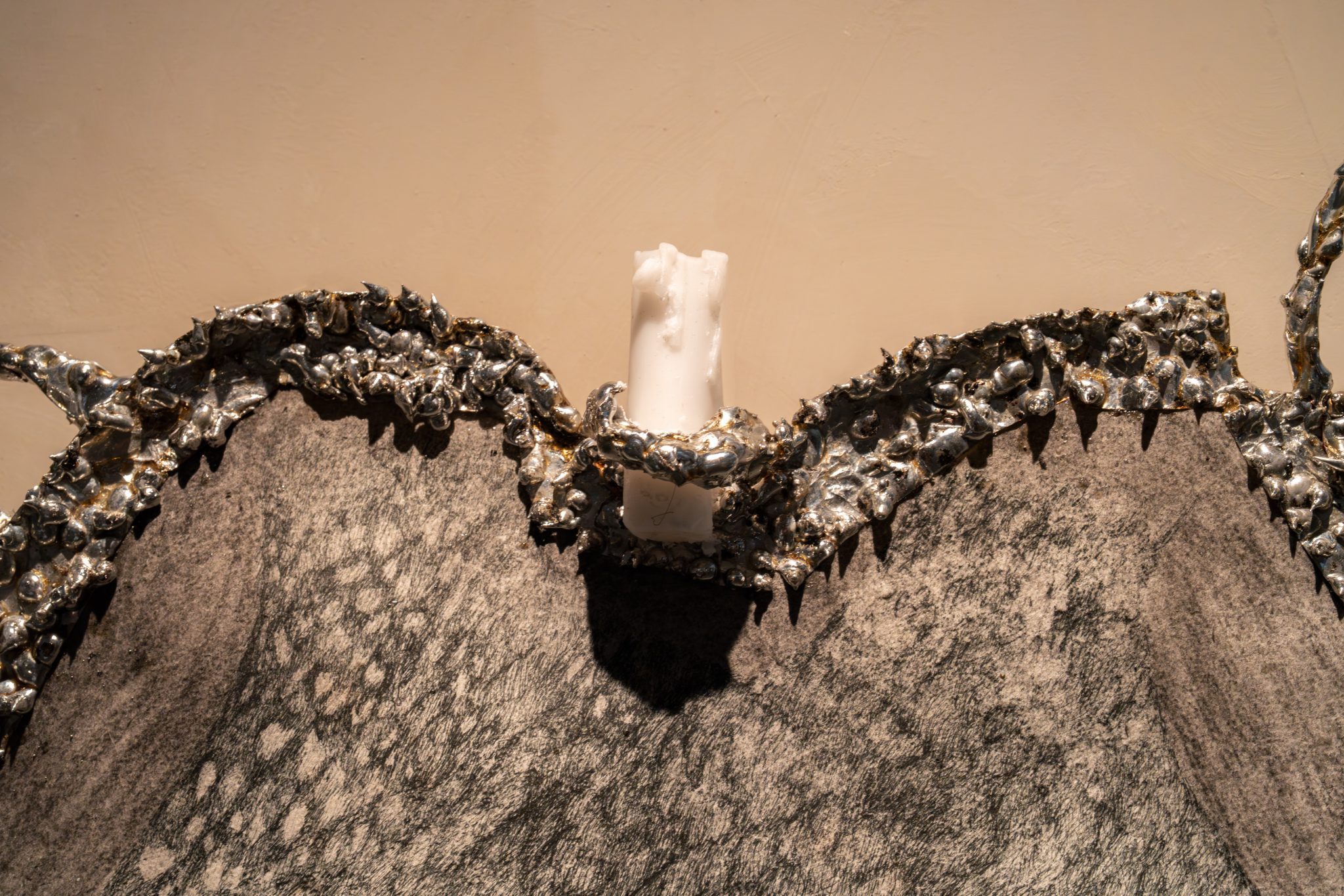 העבודה הראשונה היא רישום קיר בעיפרון, פחם ועט, שבו שני איילים שנמזגים זה בזה ללא ראש. יצרתי להם מסגרת מבדיל, ובמקום הראש עומד נר אחד במרכז.